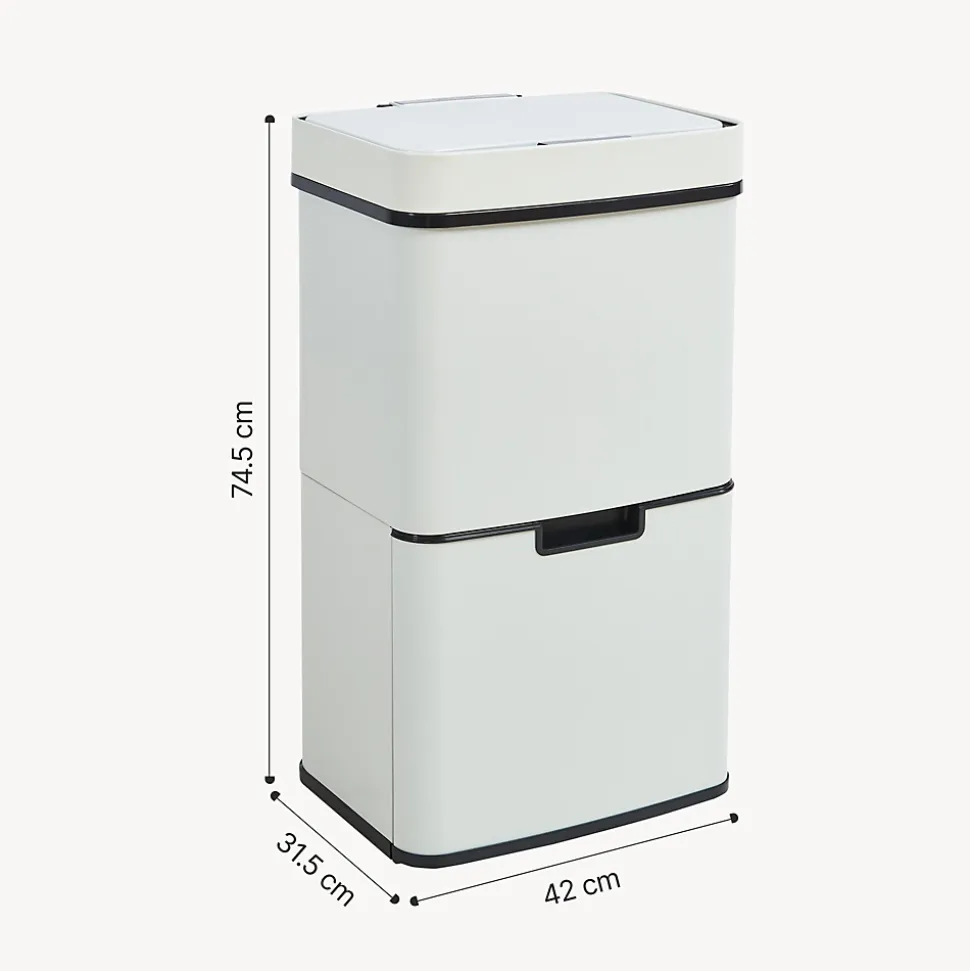 Poubelle à capteurLa poubelle séduit par son design moderne, s’adapte à toutes les cuisines et facilite le tri grâce à ses 2 compartiments pratiques. La partie supérieure, spacieuse, s’ouvre automatiquement par capteur ou manuellement et dispose d’un anneau de maintien pour garder le sac bien en place.Le couvercle se ferme silencieusement pour limiter les odeurs et maintenir une cuisine propre. La partie inférieure, équipée de 2 bacs séparés, s’ouvre comme un tiroir pour une organisation facile et un vidage confortable.Points forts du produit :- avec 2 compartiments séparés- compartiment inférieur extractible équipé de 2 poubelles- ouverture hygiénique par mouvement de la main via le capteur ou manuellement via le bouton- fonctionne sur piles (6 x AA 1,5 V) – livrée sans piles- partie supérieure avec anneau de maintien qui fixe proprement les sacs poubelle- fermeture silencieuse du couvercle pour plus de confort au quotidien- idéal pour la séparation des déchets résiduels, biologiques et recyclables à la maison- design moderne qui s’intègre harmonieusement dans toutes les cuisinesVolume de contenance :- totales : 62 L- compartiment supérieur : 37 L- compartiment inférieur : 25 L (2 x 12,5 L)Dimensions (h x l x p) :74,5 x 42 x 31,5 cmMatière :acier inoxydable + plastique (ABS + PP)Couleur :beigeContenu de la livraison :1 x poubelle avec capteur automatiqueRemarque :Les piles et les sacs poubelle ne sont PAS inclus dans la livraison !Produit de la marque :[en.casa]