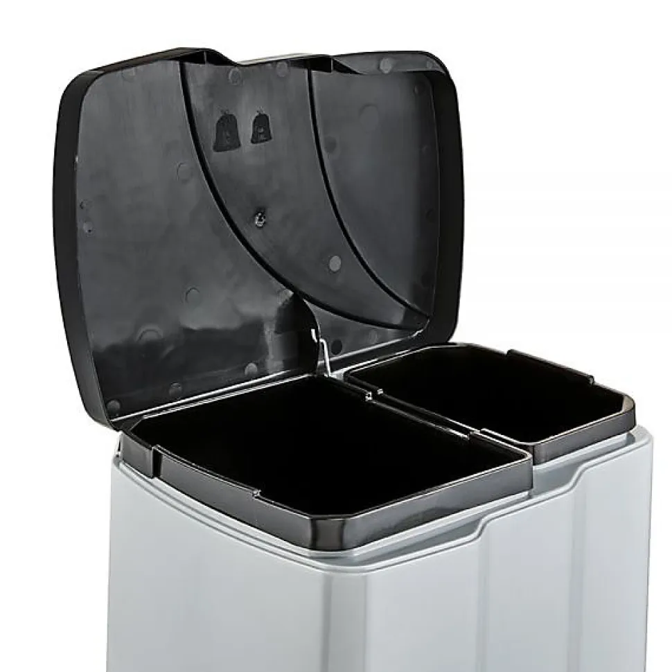 Poubelle à pédale avec 2 bacs 7 et 15 litres de la marque Allemande Keeeper, gamme Gunnar. avec 2 seaux intérieurs de 7 litres et 15 litres de capacité ouverture facile grâce à la pédale le couvercle se ferme automatiquement En polypropylène solide Sac poubelle conseillé : 18 et 25 litres Dimensions : (L) 39,5 x (P) 29 x (H) 43 cm Poubelle à 2 bacs idéale pour la séparation des déchets résiduels et des déchets à trier (carton ou verre).