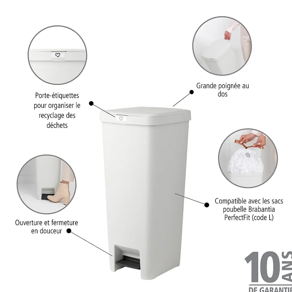 - Pas de suremballage disgracieux : sacs poubelles Brabantia PerfectFit assortis avec cordon de serrage disponibles (taille L).