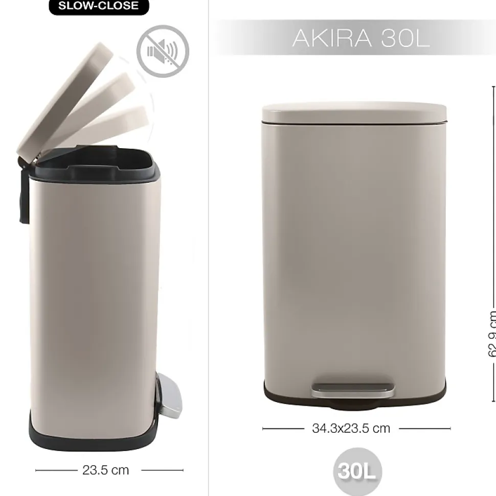 Poubelle Akira de la marque SPIRELLA.Couleur tendance, cette poubelle de 30L s’intègre parfaitement dans chaque pièce. L’insert en plastique avec poignée de transport pratique permet de vider et de nettoyer facilement le seau. La pédale permet d’ouvrir la poubelle sans effort. Confortable à ouvrir, vous n’avez pas besoin de vous baisser. La pédale de taille très grande assure une ouverture facile. Muni dun socle en plastique de protection pour éviter des rayures au sol. La poubelle se fond dans dans n’importe qu’elle pièce de façon ultra moderne.Ainsi, Spirella associe design et ergonomie pour faire d’une poubelle un objet indispensable et confortable lors de son utilisation. Dimensions: 34,3×23,5×62,9cm Contenance: 30L Couleur: Taupe Matière: Acier