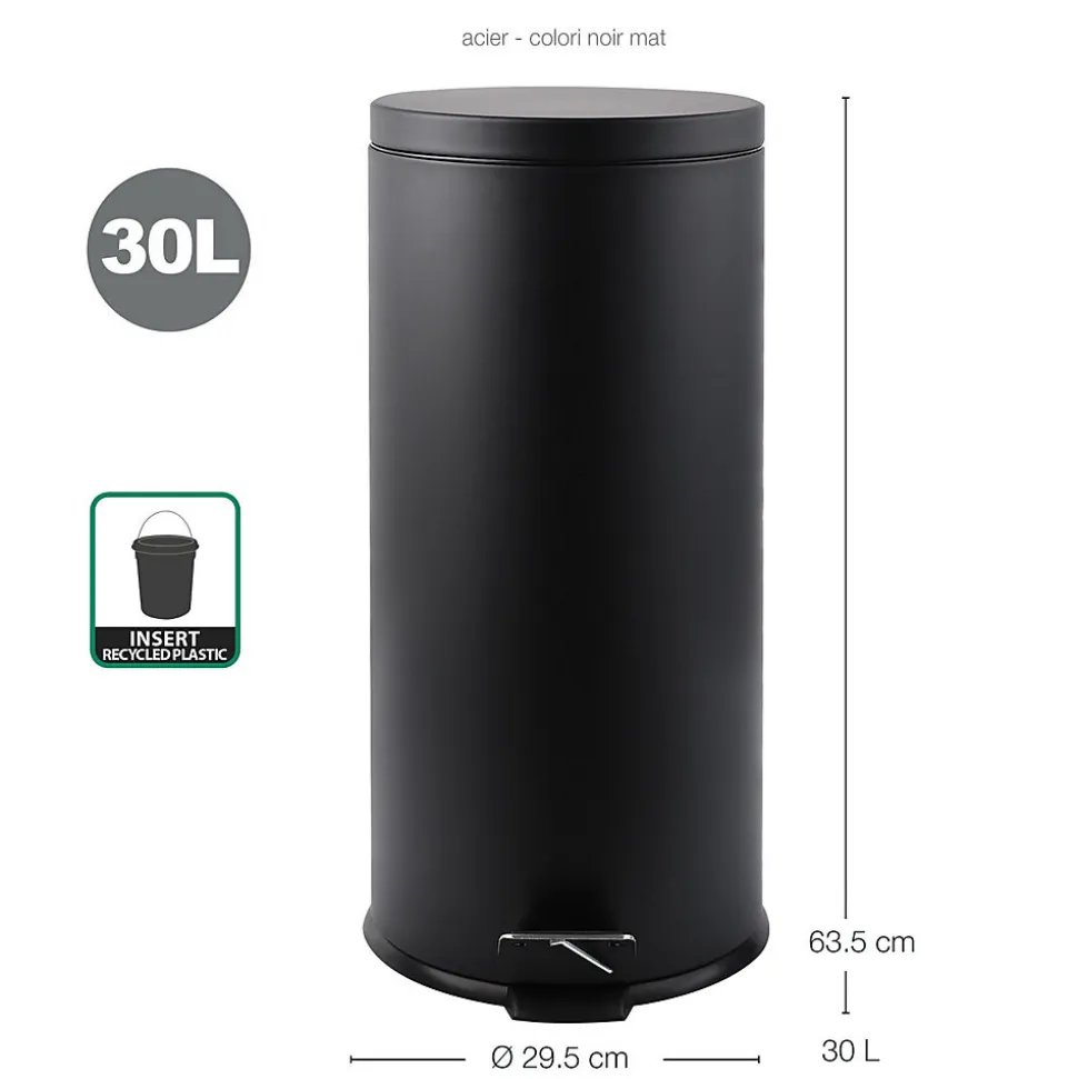 Poubelle de la marque MSV.Design moderne à la couleur tendance, la poubelle au volume de 30L s’intègre parfaitement à tous types de déco ! Stabilité élevée grâce à la forme ronde, son mécanisme à pédale antidérapante permet une ouverture facile en toute sécurité sans risque de glisser. Le couvercle s’ouvre immédiatement, sans que vous ayez besoin d’utiliser vos mains. Une poignée située au dos permet de déplacer facilement ou vous le souhaitez sans risque de vous blesser. Le seau intérieur amovible peut être retiré aisément pour être nettoyé. Confectionnée en acier Inoxydable, il est outre conforme aux normes hygiénique pour empêcher les bactéries et microbes de proliférer, mais il est d’autant plus insensible à la rouille, résistant à la corrosion et à différentes températures ce qui fait de lui une poubelle à utiliser dans toute la maison y compris les zones humides.Ainsi, la marque MSV apporte une solution associant hygiène et ergonomie pour faire d’une poubelle une satisfaction lors de son utilisation.Dimensions: 29,3×63,5cm Contenance: 30L Couleur: Noir mat Matière: Acier