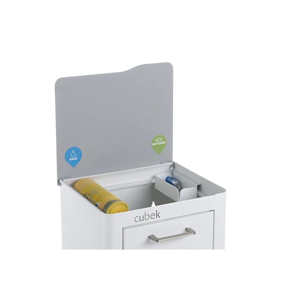 - Deux supports supplémentaires sont prévus sur la partie supérieure du meuble : un pour le rangement des piles usagées et un pour ranger le rouleau de sacs poubelles.