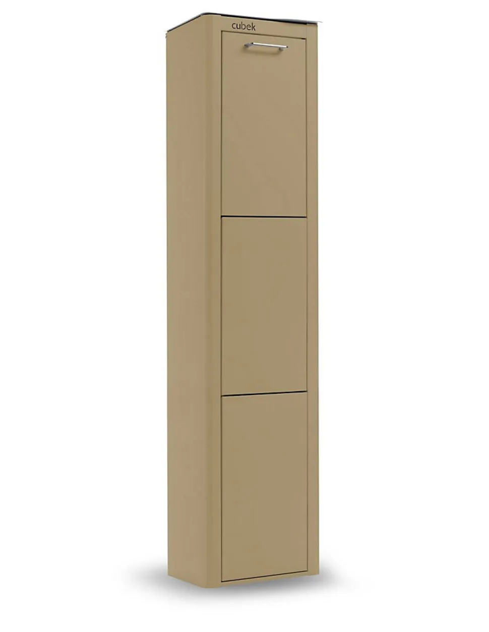 Poubelle de cuisine CUBEK – tri sélectif design et ergonomiqueLa poubelle de cuisine CUBEK est une solution de tri sélectif complète qui associe design, qualité et ergonomie, idéale pour la maison comme pour les espaces professionnels.Elle dispose de trois seaux intérieurs amovibles de 20 L, de couleurs différentes et avec poignées, facilitant le tri des déchets et le nettoyage. Sa partie supérieure intègre deux compartiments pratiques accessibles par le couvercle : l’un pour le recyclage des piles usagées et l’autre pour le rangement du rouleau de sacs poubelles, afin de regrouper tous les accessoires en un seul meuble.Son châssis en acier renforcé est équipé d’un système d’aération qui limite la condensation et les mauvaises odeurs. La structure métallique est recouverte d’un revêtement polyester durable, sans métaux lourds ni substances toxiques, garantissant une excellente longévité. Le couvercle supérieur et la poignée ergonomique assurent une utilisation confortable au quotidien.Les bords arrondis améliorent l’ergonomie et l’esthétique du meuble. La poubelle est conçue pour être fixée au mur (jeu de vis inclus).Disponible dans une large gamme de coloris (blanc, gris, noir, turquoise, sable et vert olive), CUBEK se distingue par son design exclusif et soigné : un meuble à montrer, pas à cacher.Facile d’entretien (nettoyage avec un chiffon humide), elle est fabriquée en Espagne à partir de matières premières 100 % recyclables, avec une production utilisant des énergies renouvelables. Forte de plus de 35 ans d’expérience, la marque Don Hierro garantit des meubles conçus pour durer.Dimensions : H 145 × L 33,6 × P 29,5 cmBrevet : 2945568-001CUBEK, la solution idéale pour simplifier le tri des déchets avec style et efficacité.