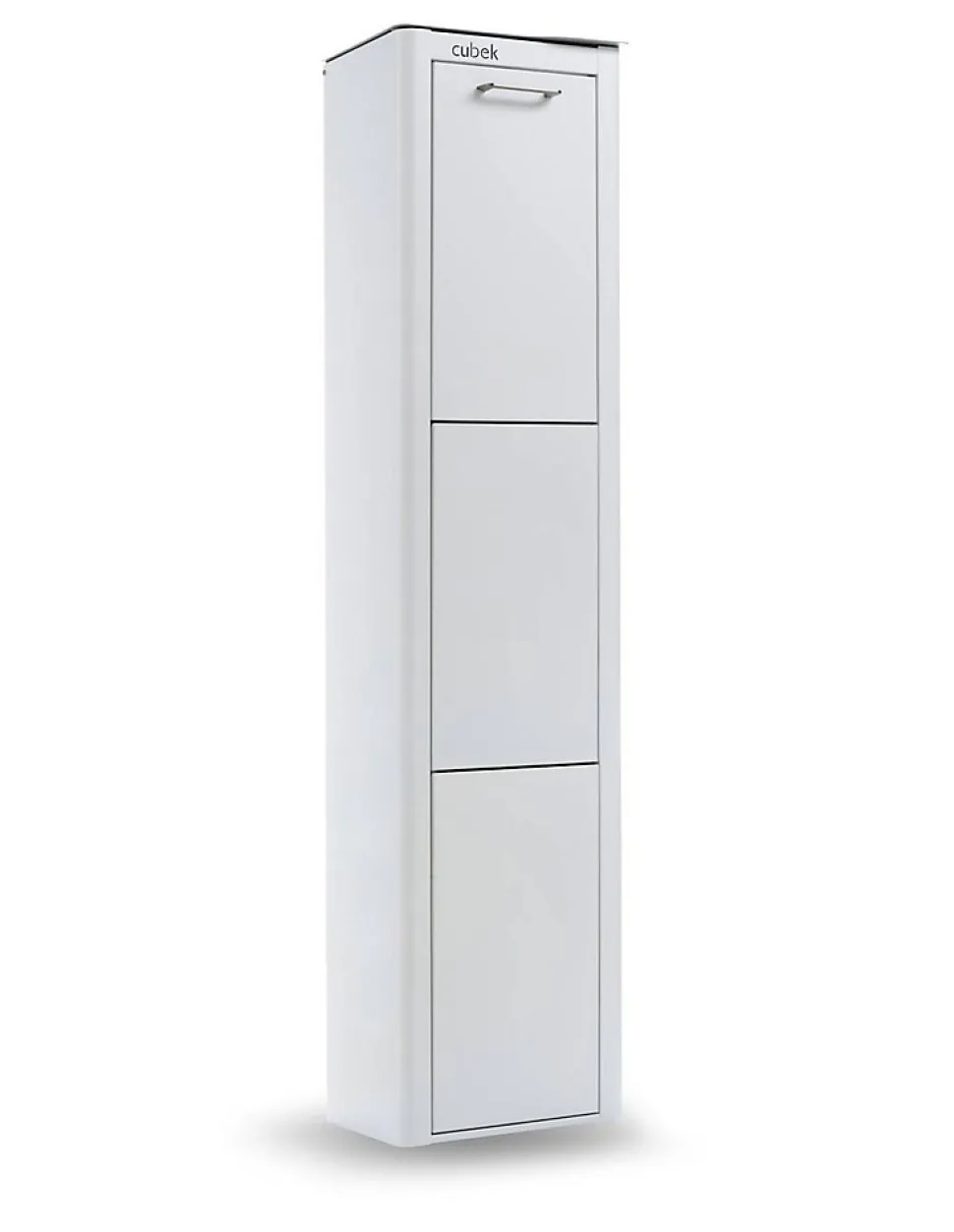 Poubelle de cuisine CUBEK – tri sélectif design et ergonomiqueLa poubelle de cuisine CUBEK est une solution de tri sélectif complète qui associe design, qualité et ergonomie, idéale pour la maison comme pour les espaces professionnels.Elle dispose de trois seaux intérieurs amovibles de 20 L, de couleurs différentes et avec poignées, facilitant le tri des déchets et le nettoyage. Sa partie supérieure intègre deux compartiments pratiques accessibles par le couvercle : l’un pour le recyclage des piles usagées et l’autre pour le rangement du rouleau de sacs poubelles, afin de regrouper tous les accessoires en un seul meuble.Son châssis en acier renforcé est équipé d’un système d’aération qui limite la condensation et les mauvaises odeurs. La structure métallique est recouverte d’un revêtement polyester durable, sans métaux lourds ni substances toxiques, garantissant une excellente longévité. Le couvercle supérieur et la poignée ergonomique assurent une utilisation confortable au quotidien.Les bords arrondis améliorent l’ergonomie et l’esthétique du meuble. La poubelle est conçue pour être fixée au mur (jeu de vis inclus).Disponible dans une large gamme de coloris (blanc, gris, noir, turquoise, sable et vert olive), CUBEK se distingue par son design exclusif et soigné : un meuble à montrer, pas à cacher.Facile d’entretien (nettoyage avec un chiffon humide), elle est fabriquée en Espagne à partir de matières premières 100 % recyclables, avec une production utilisant des énergies renouvelables. Forte de plus de 35 ans d’expérience, la marque Don Hierro garantit des meubles conçus pour durer.Dimensions : H 145 × L 33,6 × P 29,5 cmBrevet : 2945568-001CUBEK, la solution idéale pour simplifier le tri des déchets avec style et efficacité.