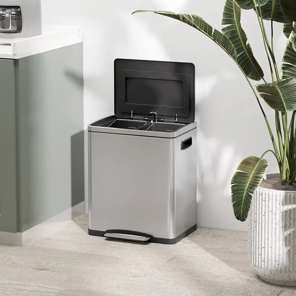 Optimisez votre cuisine avec la poubelle HOMCOM, comprenant deux compartiments de 15 litres pour trier facilement les déchets. En acier inoxydable anti traces, elle intègre un couvercle silencieux à fermeture douce et des bacs amovibles. Idéale pour les cuisines.Caractéristiques :- Poubelle de cuisine à pédale avec deux compartiments de 15L répondent aux besoins de tri sélectif des déchets- Poubelle de cuisine en acier inoxydable résistant aux traces de doigts conserve une apparence propre- Le couvercle à fermeture douce de la poubelle 30l de cuisine réduit le bruit à la fermeture- Les seaux amovibles simplifient le changement des sacs et le nettoyage- Des trous dans le seau intérieur maintiennent les sacs poubelle en place- Des poignées invisibles facilitent la mobilité- Aucun montage nécessaireSpécifications :- Couleur : argent- Matériaux : acier inoxydable 410, plastique PP- Dimensions totales : 40L x 34,8l x 47,5H cm- Volume : 2 x 15L- Réf. : 851-038V00SR