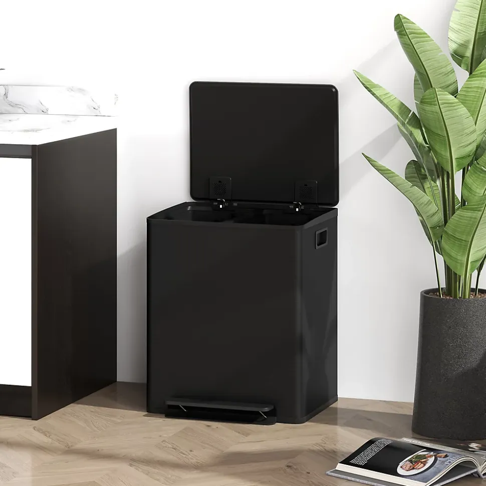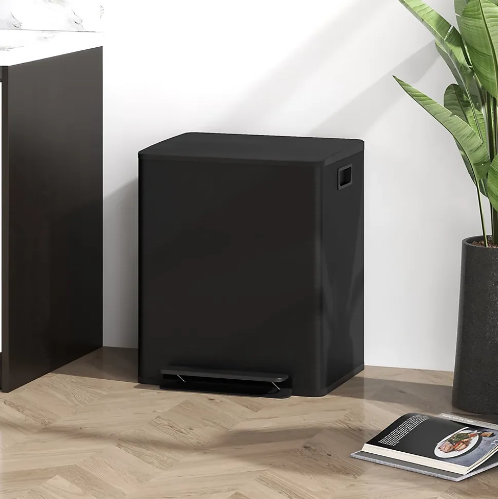 Optimisez votre cuisine avec le bac HOMCOM anti-odeur, composé de deux compartiments de 25L et un couvercle à fermeture douce. En acier inoxydable anti-traces, il intègre une pédale et des seaux amovibles pour faciliter son usage et nettoyage.Caractéristiques :- Poubelle de cuisine à pédale avec deux compartiments de 25L pour répondre aux besoins de tri des déchets séparés- Couvercle à fermeture douce et maintien ouvert, avec emplacements pour désodorisant afin de contrôler les odeurs (désodorisant non inclus)- Poubelle de cuisine en acier inoxydable 410 résistant aux traces de doigts avec finition polie et scellée à l’huile- Design élégant et épuré pour cuisines, bureaux ou espaces de travail- Poubelle à pédale avec deux seaux intérieurs amovibles pour un nettoyage facile- Pédale au pied pour libérer vos mains- Poignées latérales pour un transport facile- Aucun montage nécessaireSpécifications :- Couleur : noir mat- Matériau : acier inoxydable 410, plastique PP- Dimensions totales : 47,7L x 37,5l x 56H cm- Volume : 50 l- Réf. : 851-037V02BK