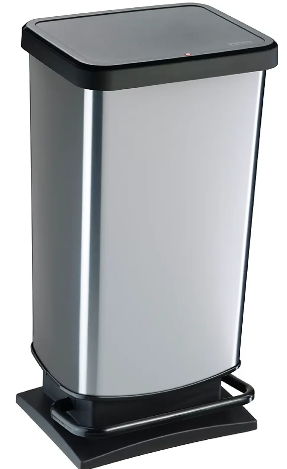 Poubelle à pédale 40 L avec décor effet métal. La poubelle accepte les sacs de 50L. Système d’ouverture avec pédale large et de fermeture silencieuse avec retenue. équipé d’une tringue en métal et d’un système d’accroche pour sac poubelle. Possède des patins anti-dérapants. La poubelle est facile d’entretien, ne rouille pas et résiste aux chocs léger sans se déformer. Fabriquée en Suisse.