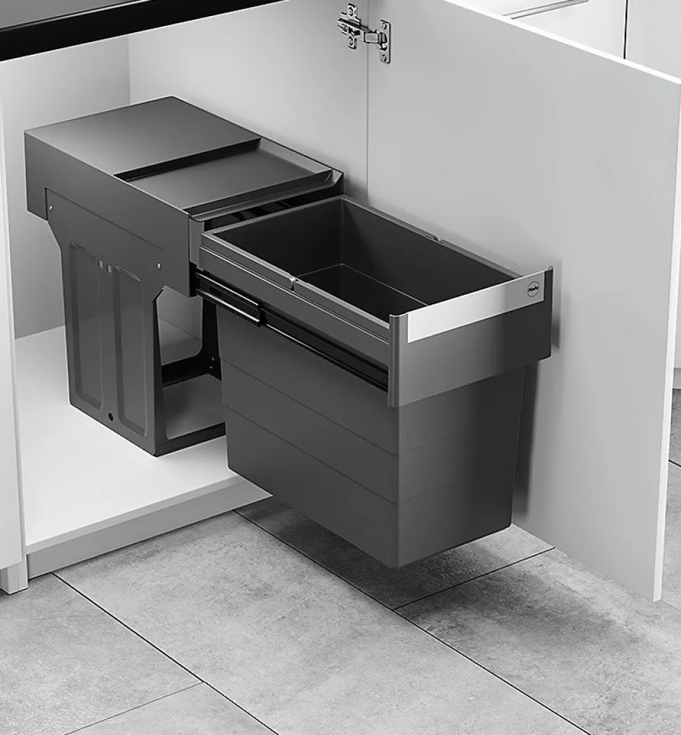 Poubelle de cuisine encastrable 28L Hailo AS Tandem – Gris Anthracite – 1 bac amovible de 28L – Ouverture de la poubelle à la main – Conçue pour meubles à porte battante d’une largeur minimum de 30 cm – Se fixe au sol du meuble – Glissières silencieuses et durables – Montage simple et rapide – Design moderne