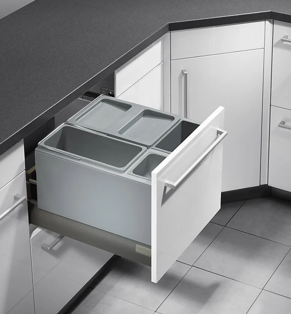 Poubelle de cuisine encastrable Hailo AS XXL 30L – Grise – 1 bac de 18L couvercle inclus + 1 bac de 12L + 1 bac de 4.1L pour vos produits ménagers + 1 dépose ustensile – Bacs amovibles en plastique gris – Conçue pour meubles coulissants avec tiroir d&