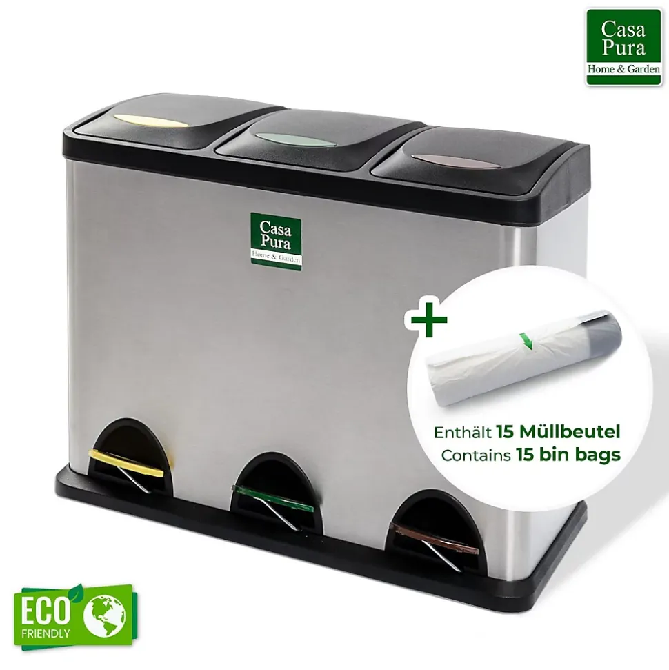 Poubelle « Brandon »Le système de tri des déchets est une poubelle élégante et pratique qui rend le tri des déchets amusant. Plusieurs compartiments (2 ou 3) sont disponibles pour trier vos déchets. La poubelle en acier inoxydable et en plastique a une capacité de 24, 36 ou 54 litres. Les seaux amovibles séparément ont une capacité de 8 ou 18 litres chacun.La poubelle est idéale pour trier les déchets ménagers quotidiens de manière.. Vous pouvez décider individuellement quel compartiment vous souhaitez utiliser pour quel type de déchets. Les compartiments du conteneur sont identifiés par un code couleur sur le dispositif à pédale. Chaque compartiment du système de tri s’ouvre avec sa propre pédale – les mains ne sont pas nécessaires. De plus, chaque compartiment du conteneur a son propre couvercle en plastique – il n’est donc pas nécessaire d’ouvrir tout le conteneur. Les seaux intérieurs peuvent être retirés séparément, ce qui facilite le vidage.Système de séparation des poubelles « Brandon » – Caractéristiques du produit :Marque: Matériau: acier inoxydable, plastique3 variantes : volume 24 l (3×8 l), volume 36 l (2×18 l) ou volume 54 l (3×18 l)Dimensions : 410x345x565 mm (variante à 2 compartiments), 470x283x395 mm (3 compartiments), 605x345x565 mm (3 compartiments)Seau intérieur amovible avec poignée de transport2 bacs intérieurs (pour 36 l) ou 3 bacs intérieurs (pour 24 l & 54 l)Système de séparation pour un tri optimal des déchets