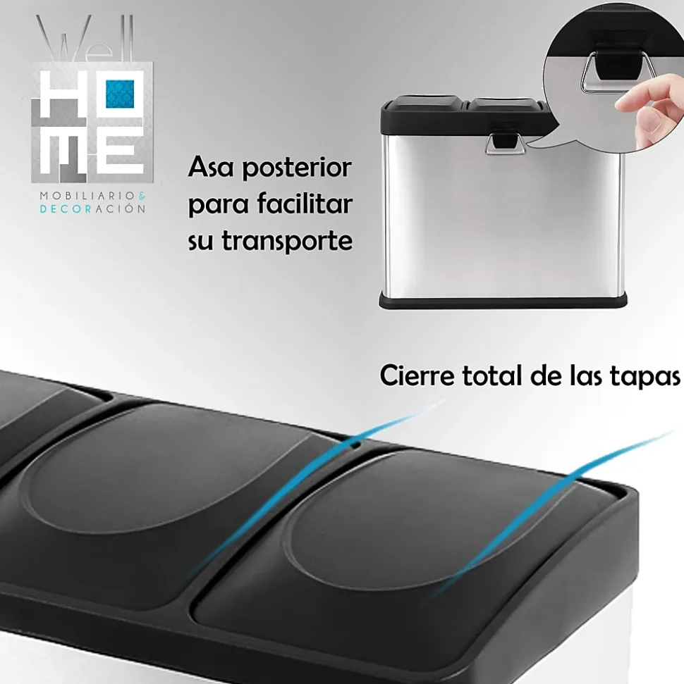 Poubelle de recyclage à 3 compartiments pour un tri facile des déchets. Capacité totale de 45 litres.Elle est équipée de 3 pédales indépendantes, une pour chaque compartiment. Fabriquées en aluminium avec des détails noirs, chaque pédale est d’une couleur différente (jaune, verte et noire) pour identifier facilement le type de déchet et sensibiliser même les enfants au tri sélectif.Les bacs intérieurs sont en plastique, ce qui les rend très robustes, durables et faciles à nettoyer.Chaque compartiment de cette poubelle permet un tri sélectif efficace : verre, papier et plastique peuvent être collectés séparément. Des sacs peuvent également être ajoutés.Chaque compartiment a une capacité d’environ 15 litres, pour une capacité totale de recyclage d’environ 45 litres, ce qui la rend très fonctionnelle.Grâce à ses dimensions idéales, cette poubelle s’intègre partout et dans tous les environnements : cuisine, maison, bureau, jardin, à l’intérieur comme à l’extérieur.Avec ces poubelles, vous pouvez jeter vos déchets et emporter vos sacs avec vous. Ainsi, vous évitez de jeter davantage de plastique à la poubelle et vous éliminez le plastique à usage unique en utilisant ces excellents sacs de recyclage réutilisables.