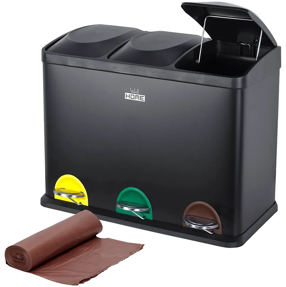 Poubelle de recyclage noire à 3 compartiments + sacs poubelle à fermeture automatique.- Cette poubelle a une capacité de 45 L. Elle est équipée de 3 pédales indépendantes pour chaque compartiment.Fabriquée en aluminium noir, chaque pédale est colorée (jaune, vert et noir) pour identifier facilement le type de déchet.Seaux intérieurs en plastique. Chaque compartiment de cette poubelle de recyclage permet le tri sélectif des déchets.Chaque bac a une capacité d’environ 15 L chacun. Cette poubelle s’intègre facilement à tous les espaces et environnements.- Livrée avec 20 sacs poubelle en polyéthylène à fermeture automatique, d’une capacité de 20 L.Spécialement conçue pour le tri sélectif : idéale pour les déchets organiques. Chaque sac mesure 45 x 55 cm.