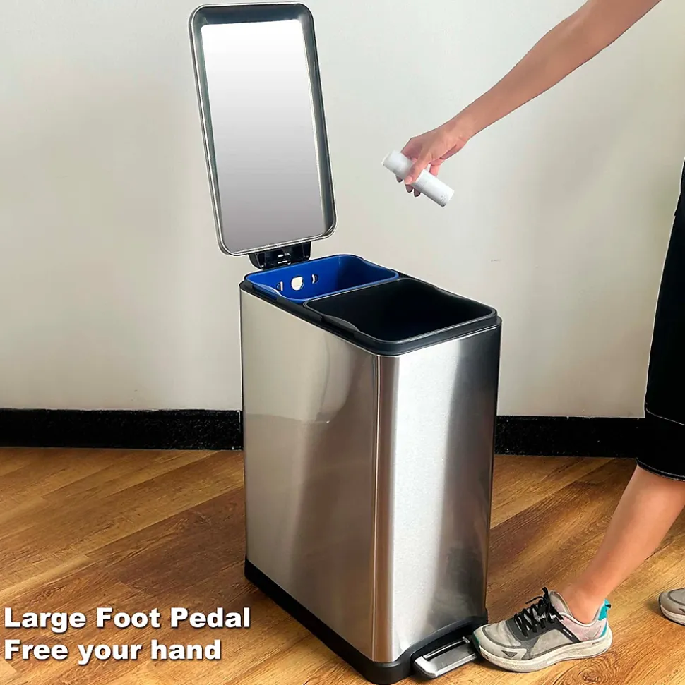 - Inclus : 2 seaux en plastique pour maintenir votre sac poubelle, et un bord de protection en plastique pour la protection des sols fragiles. Idéal pour le tri de vos déchets : bouteilles en plastique, verre, journaux, carton, et ordures ménagères. Pratique et hygiénique. Ses matériaux lisses (fer non-corrosif inox) facilitent son entretien