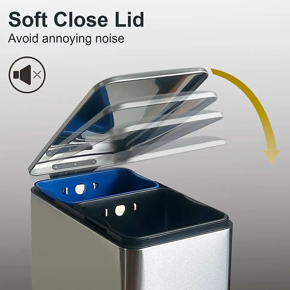 - Cette poubelle a tout pour plaire. Nul besoin de la cacher dans un coin : faites en un élément à part entière de votre déco. Idéal pour la cuisine, la salle de bain, le bureau, la chambre, la buanderie et tout autre endroit de passage où vous avez besoin d’une poubelle. Look moderne et élégant. Apportez une touche d’élégance à votre cuisine avec la poubelle Edge en acier inoxydable brossé. Les matériaux lisses et non corrosifs de cette poubelle facilitent son entretien et en font un choix hygiénique pour la gestion de vos déchets. Le système de fermeture douce et silencieuse avec amortisseur et fermeture ralentie rendent son utilisation pratique et agréable. Le compartiment de 30 L et le compartiment de 20 L permettent un tri sélectif facile des différents types de déchets. Inclus avec la poubelle, deux seaux en plastique pour maintenir votre sac poubelle en place et un bord de protection en plastique pour protéger les sols fragiles. Cette poubelle est également très facile à déplacer