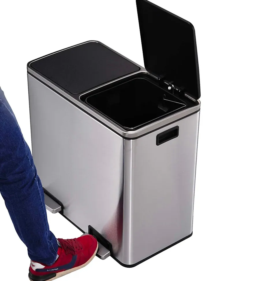 - Poubelle de cuisine à pédale tri sélectif rectangulaire avec seau capacité 60 L (2 compartiments de 30 L) modèle Major en acier inoxydable finition inox brossé. Dimensions : 60 x 36 x 65 cm. Poids : 11,6 kg. Corps en acier inox (0,4 mm) et couvercle en PP noir.