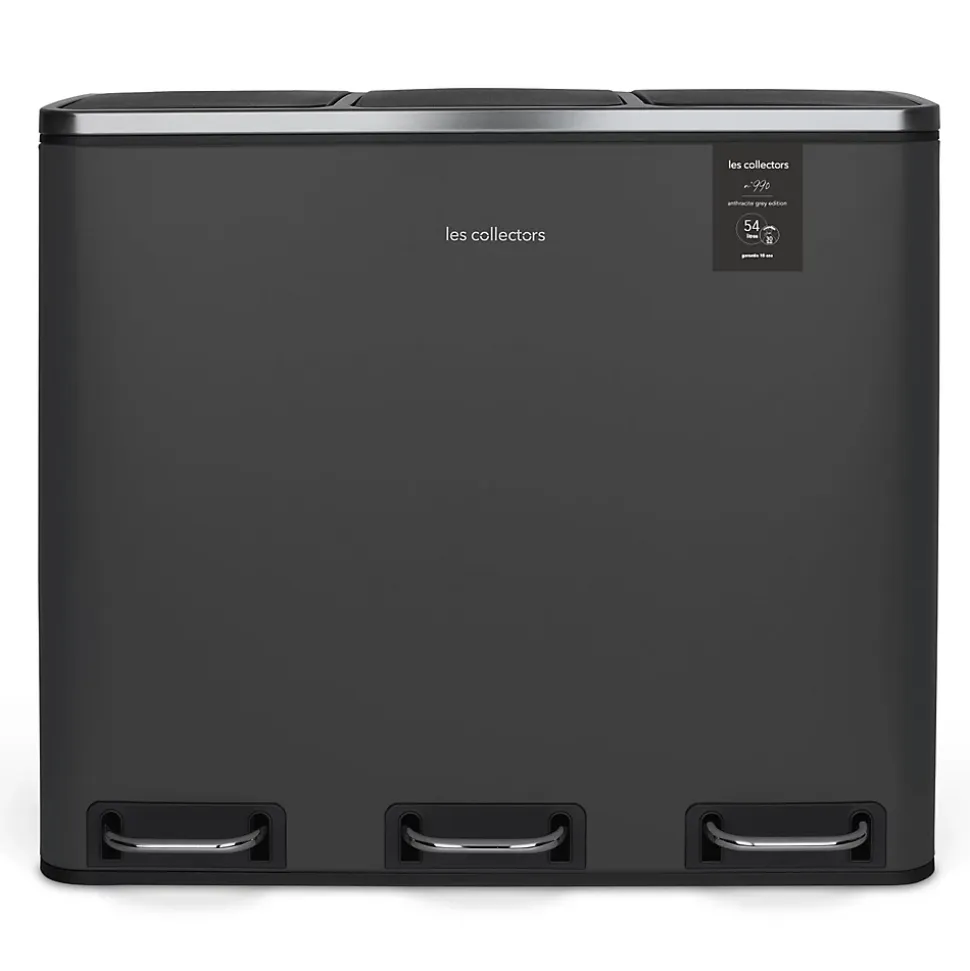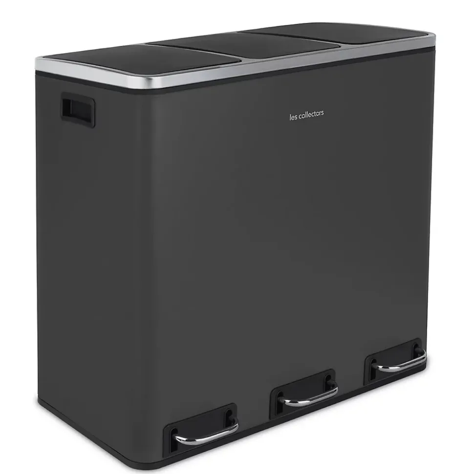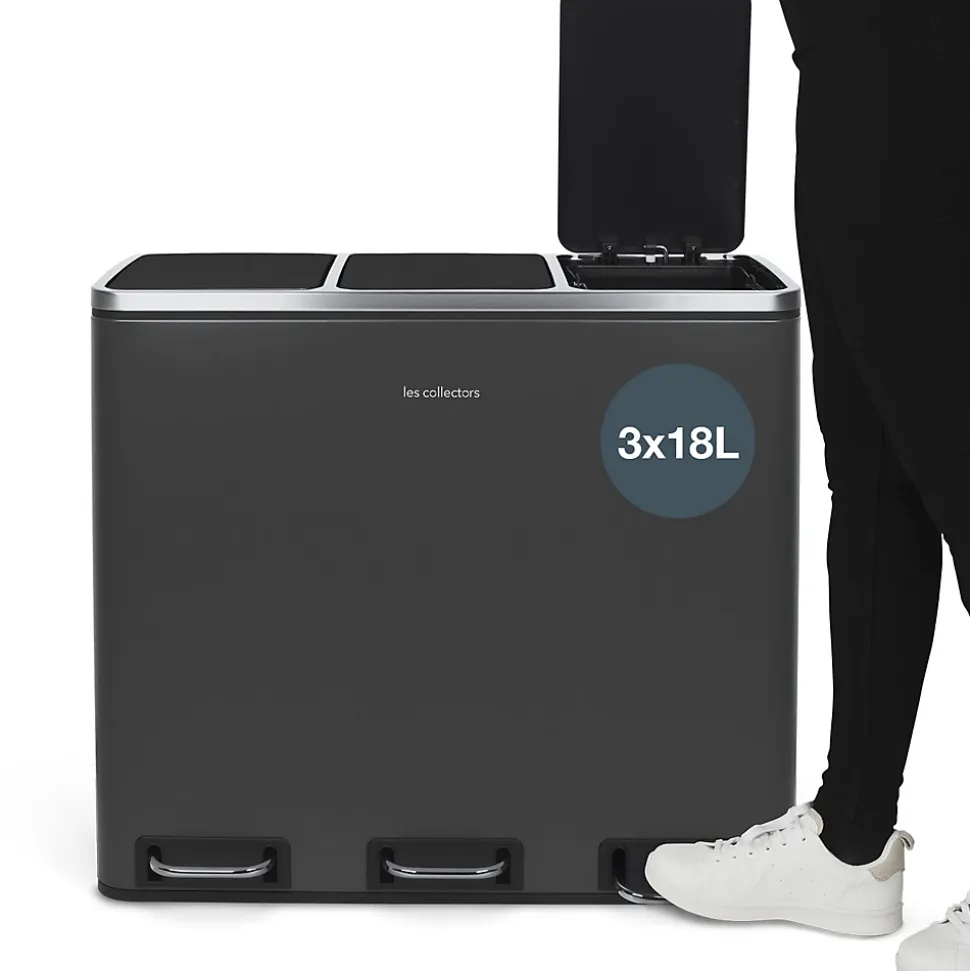 Cette poubelle de 54L vous facilite le tri sélectif au quotidien. Organisez vous-même la gestion des déchets selon vos habitudes de consommation.Grâce à ses 3 compartiments avec couvercles séparés, vous n’ouvrez qu’un seul bac à la fois et évitez ainsi la propagation d’odeurs désagréables pouvant provenir d’autres bacs.La fermeture des couvercles est lente et silencieuse pour un confort et une discrétion totale au quotidien.Ses 3 pédales en métal et son corps en acier inoxydable sont gages de robustesse et de qualité.Les bacs de chaque compartiments sont amovibles et possèdent une anse qui facilitent le changement de sac ainsi que son entretien.Design et écologique, elle s’intègre parfaitement dans une cuisine ou des bureaux.CARACTÉRISTIQUES :Poubelle de tri à pédale 3 compartimentsCapacité : 54 L (3 x 18 L)Forme : rectangulaireCorps en acier inoxydableFinition anti-traces de doigtsFermeture du couvercle silencieuse3 bacs intérieurs amoviblesPédale en acierPieds antidérapantsDimensions : 61,5 (L) x 34,4 (P) x 56 (H) cm
