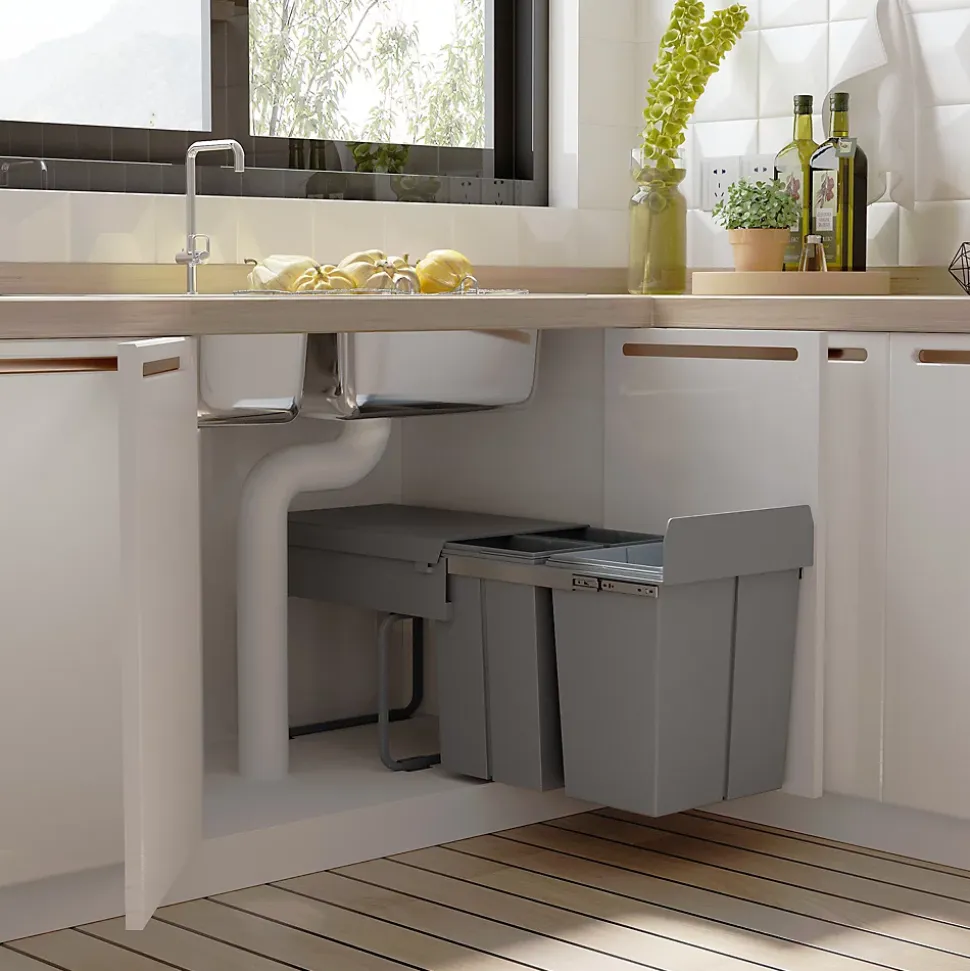 Cette poubelle de tri coulissante vous aidera à trier facilement vos déchets dans différentes poubelles. C’est un geste simple mais très important pour la valorisation de vos déchets.Caractéristiques :- Poubelle encastrable à glissière pouvant être installée dans un meuble bas de cuisine d’une profondeur minimale de 50 cm- Poubelle de tri coulissante pratique car dissimule les déchets derrière votre meuble de cuisine- Poubelle à glissière solide fixée à la base de l’unité pour plus de flexibilité- Mécanisme de fermeture en douceur pour une ouverture et une fermeture silencieuses- Equipée de 3 bacs internes recouverts : permet de dissimuler les déchets mais peut aussi être utilisés pour ranger de petits objets- Facile à nettoyer, à utiliser et à entretenir dans votre cuisine (chaque bac est amovible avec poignée)Spécifications :- Couleur : gris- Matériaux principaux : métal, ABS, PP- Dim. totales : 48L x 34,2l x 41,8H cm- Dim. grand bac : 30,5L x 22l x 36H cm- Dim. petits bacs : 22,5L x 15l x 36H cm- Volume total : 40L (2 x 10L et 1 x 20L)- Livraison en un colis- Réf. : 851-002