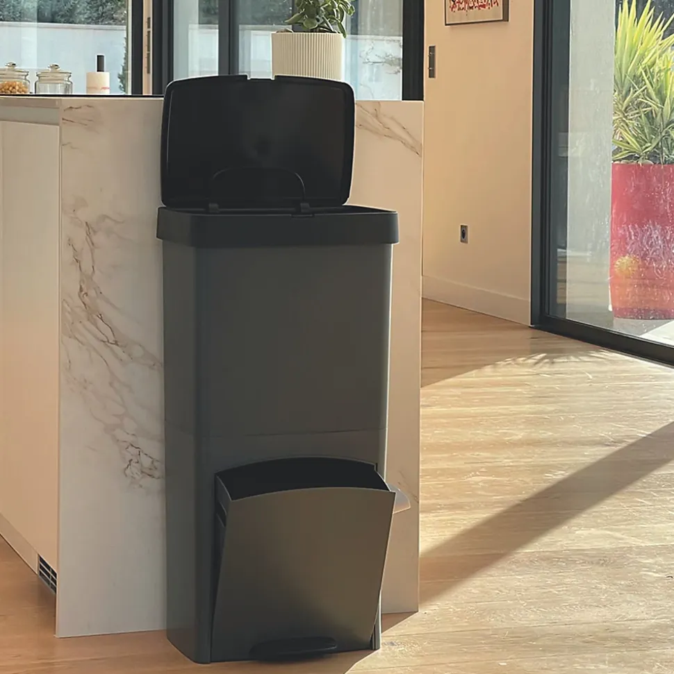 - Fabriqué en Europe. En plastique recyclé. capacité 70 L couleur noir gris anthracite. Dimensions : env. l. 39 x P. 29 x H. 76.5 cm. Compact et facilement intégrable. Avec un encombrement de seulement 39 x 29 cm et 2 ou 3 compartiments, cette station de tri remplace 3 poubelles, n’encombre pas votre cuisine. Poids : 3,5 kg légère et facile à déplacer.