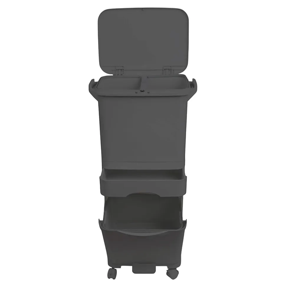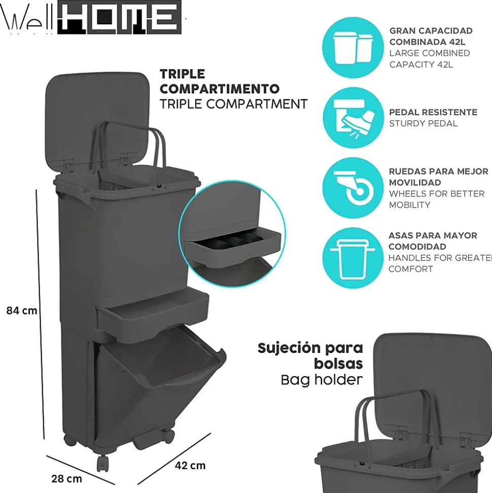 Triple compartiment pour le tri sélectif, offrant trois compartiments distincts : un de 24 L, un de 4 L et un de 14 L, permettant de séparer facilement les différents types de déchets recyclables.Avec une grande capacité combinée de 42 litres, c’est la poubelle idéale pour un usage quotidien intensif tout en conservant un design compact.Séparation des déchets secs et humides. Ouverture en un clic. Robuste et durable.Molettes universelles incluses pour un déplacement facile. Système de pédale pour une ouverture simple et sans effort. Compartiments multifonctionnels pour une élimination facile des déchets.Met en place des crochets et des poignées latérales pour suspendre les sacs ou tenir la poubelle comme un chariot. Elle dispose également d’un tiroir intégré pour les petits accessoires ou les sacs poubelle.Avec ses dimensions compactes de 42 x 28,2 x 84 cm, elle est conçue pour s’intégrer parfaitement dans la poubelle et offre une grande capacité de rangement.