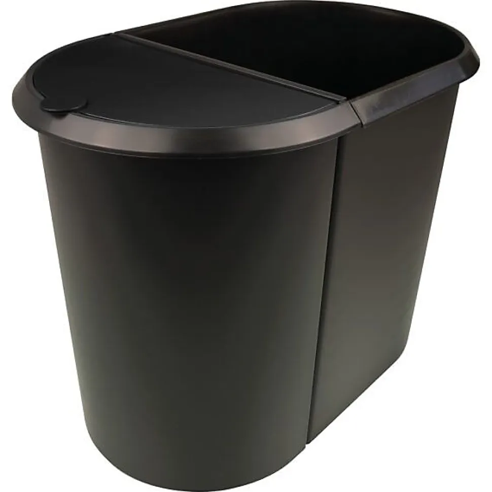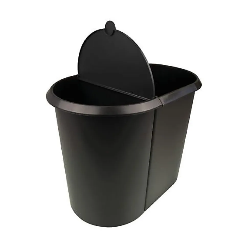 Corbeille à papier « the double », ovale, de la marque Hellit. Avec bord de préhension circulaire pratique.1ère partie: 20 litre pour collecter le papier, 2ème partie: 9 litres avec couvercle pour les déchets humides ou autres déchets.Dimensions : (L) 27 x (P) 44 x (H) 34,8 cm sacs poubelle conseillés : 35 litres pour la 1ère partie / 20 litres pour la 2ème partie – pour un tri sélectif des déchets au lieu de travail- le tri des déchets peut être déterminé grâce aux différentes couleurs de couvercle- couvercle pour éviter les odeurs