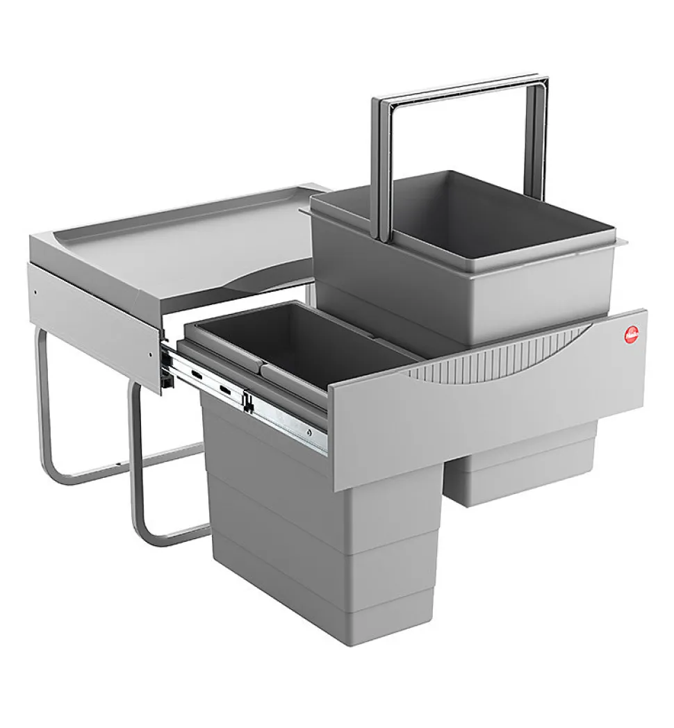 Poubelle de cuisine encastrable Hailo Raumspar Tandem S – Grise – 2 bacs amovibles de 18 et 12L – Ouverture de la poubelle à la main – Conçue pour meubles à porte battante d’une largeur minimum de 50 cm – Se fixe sur le sol du meuble – Tri sélectif plus facile – Gain de place – Montage simple et rapide