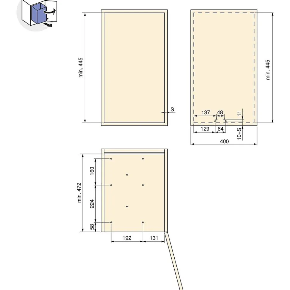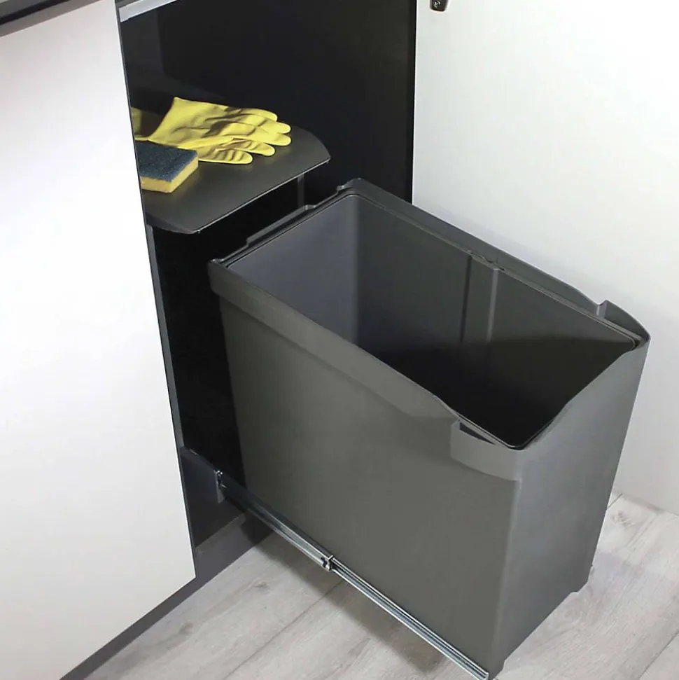Aspect : Coloris = Gris anthracite • Matériau principal = Plastique • Dimensions : Hauteur (en cm) = 44,20 • Longueur (en cm) = 45,20 • Profondeur (en cm) = 26 • Autres caractéristiques : Composition = 1 cadre avec coulisses + 1 conteneur + vis de montage • Contenance (en L) = 30 • Informations complémentaires = Fixation par le bas , Coulissant automatique ou manuel , A installer dans les modules à ouverture droite ou gauche , Retrait du conteneur et ouverture du couvercle automatiques actionnés par la porte , Dispose d’un cadre avec coulisses à billes pour glisse en douceur , • Montage = A installer dans des modules de 40 cm pour installation automatique – dimensions internes minimales de 47.2 x 44.5 cm (PxH) ou des modules de 30 cm pour retrait manuel possibles • Poids (en kg) = 4,67 • Poubelle fixation inférieure et extraction automatique 30 L