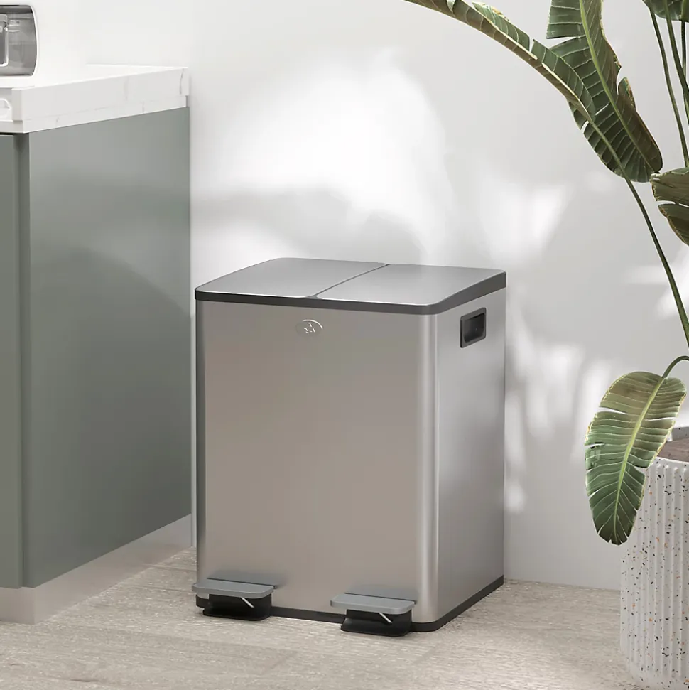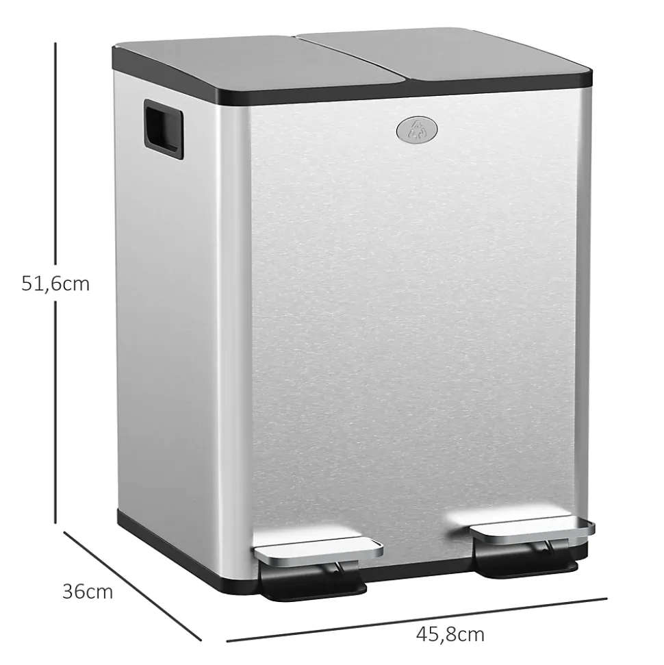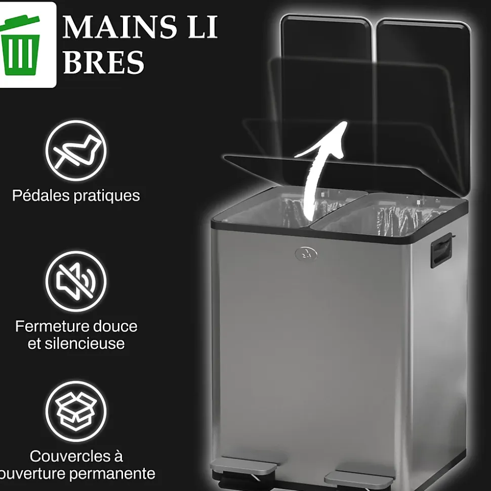 Avec son design moderne, cette poubelle manuelle est parfaite pour équiper votre cuisine. Munie de deux couvercles à fermeture silencieuse et douce, ainsi qu’une option de maintien ouvert, cette poubelle à pédale facilite son usage au quotidien. Grâce à sa grande capacité (20L au total) et à ses 2 compartiments, elle est parfaite pour trier vos déchets et pouvoir les recycler correctement en toute simplicité.Caractéristiques :- Poubelle de cuisine en acier inox. brossé idéale pour ajouter une touche de modernité supplémentaire à votre intérieur- Deux couvercles à fermeture silencieuse et douce, ainsi qu’une option de maintien ouvert- 2 compartiments différents pour séparer efficacement vos déchets- Facile à nettoyer grâce à son revêtement anti-empreintes digitales et son couvercle amovible- Capacité totale de 40L répartie en 2 bacs de 20L chacunSpécifications :- Couleurs : acier inox. brossé, gris- Matériaux principaux : acier inoxydable 410, plastique PP- Dim. totales : 45,8L x 36l x 51,6H cm- Capacité totale déchets : 40L- Volume : 2 x 20 L- Livraison en un colis- Réf. : 851-033V01SR