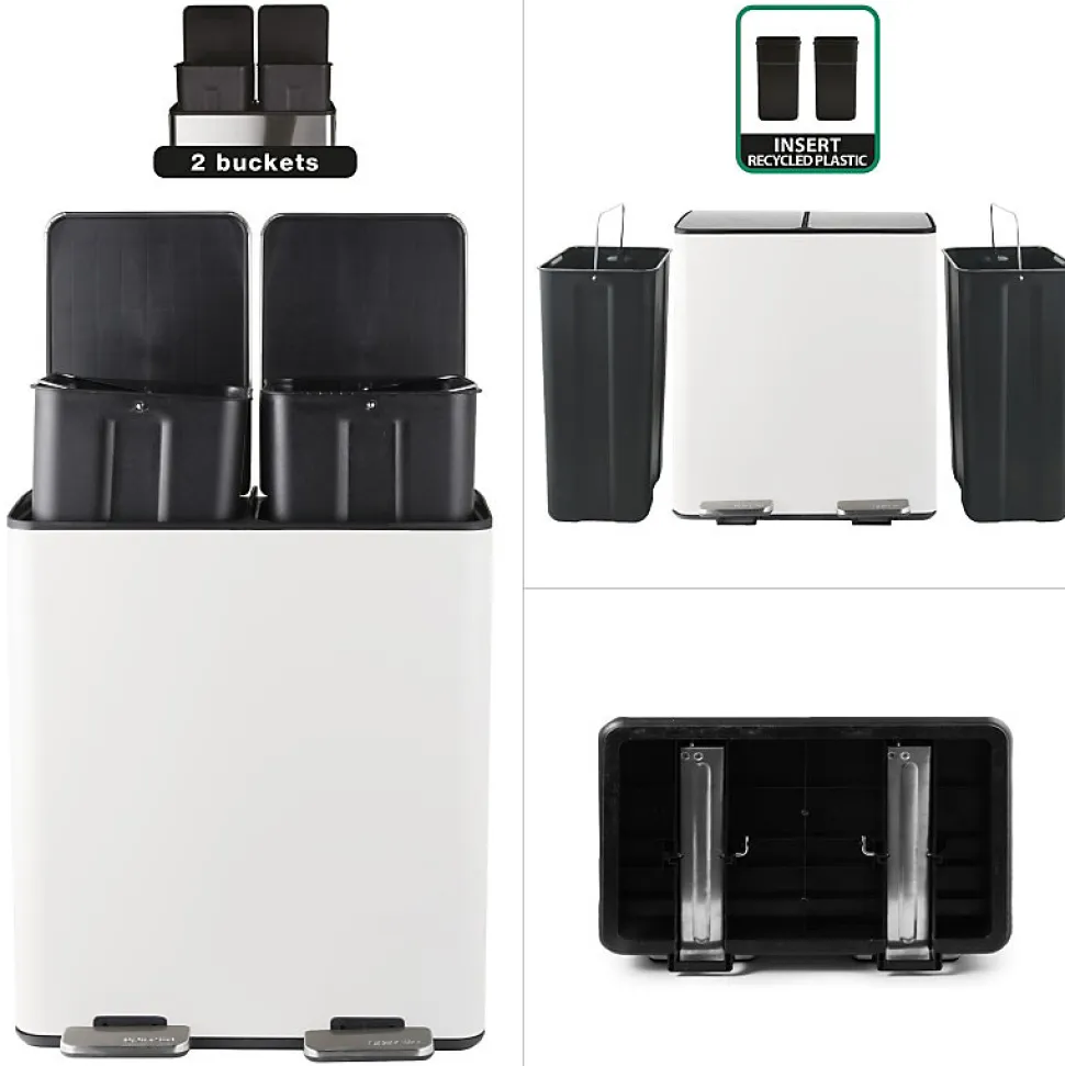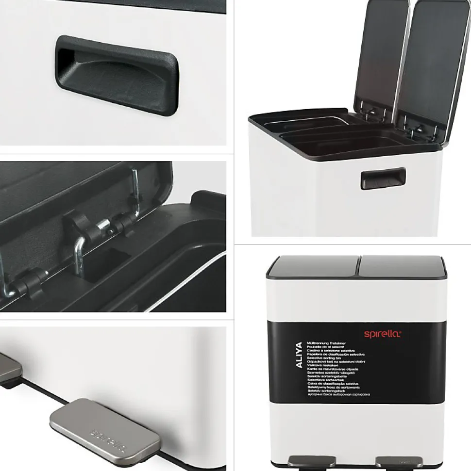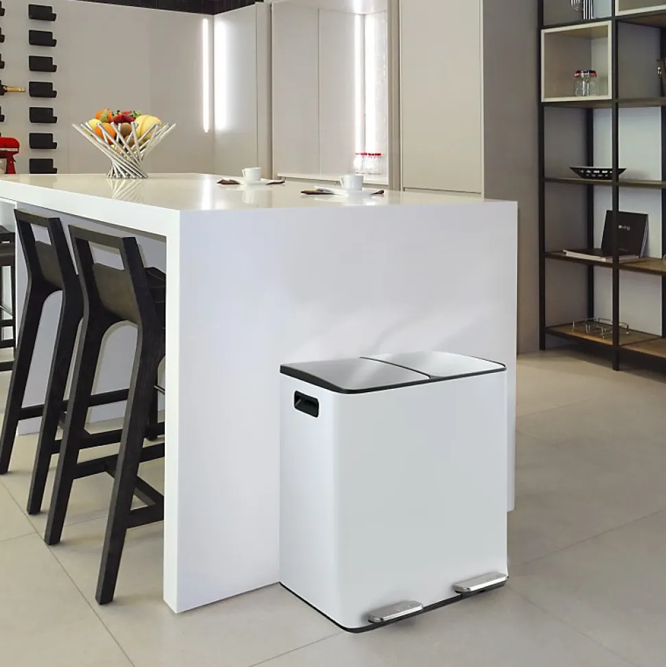 Poubelle de la marque SPIRELLATriez vos déchets avec élégance. Notre poubelle de cuisine tri sélectif combine à la fois design élégant ainsi que toutes les fonctionnalités pour une gestion facile des déchets à la maison. C’est la version avec deux conteneurs intérieurs: 20L chacun.Ce séparateur de déchets permet de trier facilement les déchets. Confortable à utiliser, cette poubelle tri-sélectif a tout pour plaire: 2 contenants de 20L parfaits pour la séparation des ordures rapide: papier, cartons, déchets alimentaires etc… Convient pour une utilisation en intérieur: poubelle de cuisine ou en extérieur : caves, Jardin, etc. C’est également un bon moyen d’apprendre les bases du recyclage à vos enfants.POUBELLE ERGONOMIQUE, TOUT EN DOUCEUR: Son couvercle ingénieux slow-close permet au couvercle de se fermer de manière douce et retient les mauvaises odeurs à l’intérieur. Les deux poignets extérieurs permettent de déplacer la poubelle en toute sécurité.MATÉRIAUX DE QUALITÉ: la poubelle est constituée d’acier de qualité supérieure garantissant une longue durée de vie ainsi qu’un aspect sobre et élégant. Les seaux amovibles, constitués de plastique recyclés sont faciles à nettoyer et transportable grâce à leur poignées.Dimensions: 45x30x51cm Contenant: 40L (2x20L) Couleur: Blanc Mat & couvercle couleur inox. Matière: Acier