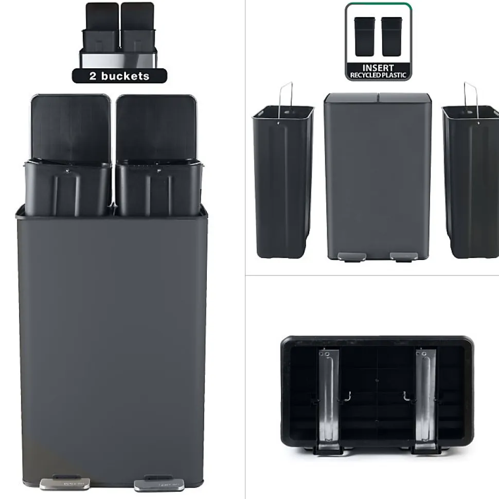 Poubelle de la marque SPIRELLATriez vos déchets avec simplicité.Notre poubelle de cuisine tri sélectif combine à la fois design élégant ainsi que toutes les fonctionnalités pour une gestion facile des déchets à la maison.C’est la version avec deux conteneurs intérieurs: 30L chacun.Ce séparateur de déchets permet de trier facilement les déchets. Confortable à utiliser, cette poubelle tri-selectif a tout pour plaire: 2 contenants de 20L parfaits pour la séparation des ordures rapide: papier, cartons, déchets alimentaires etc… Convient pour une utilisation en intérieur: poubelle de cuisine ou en extérieur : caves, Jardin, etc. C’est également un bon moyen d’apprendre les bases du recyclage à vos enfants.POUBELLE ERGONOMIQUE, TOUT EN DOUCEUR: Son couvercle ingénieux soft-close permet au couvercle de se fermer de manière douce et retient les mauvaises odeurs à l’intérieur.Les deux poignets extérieurs permettent de déplacer la poubelle en toute sécurité.MATÉRIAUX DE QUALITÉ: la poubelle est constituée d’acier de qualité supérieure garantissant une longue durée de vie ainsi qu’un aspect sobre et élégant. Les seaux amovibles, constitués de plastique recyclés sont faciles à nettoyer et transportable grâce à leur poignées.Dimensions: 45x30x68cm Contenant: 60L (2x30L) Couleur: Gris Mat & couvercle couleur inox. Matière: Acier