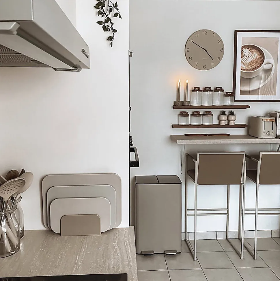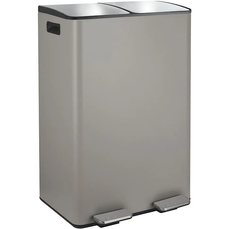 Poubelle de la marque SPIRELLATriez vos déchets avec simplicité.Notre poubelle de cuisine tri sélectif combine à la fois design élégant ainsi que toutes les fonctionnalités pour une gestion facile des déchets à la maison.C’est la version avec deux conteneurs intérieurs: 30L chacun.Ce séparateur de déchets permet de trier facilement les déchets. Confortable à utiliser, cette poubelle tri-selectif a tout pour plaire: 2 contenants de 20L parfaits pour la séparation des ordures rapide: papier, cartons, déchets alimentaires etc… Convient pour une utilisation en intérieur: poubelle de cuisine ou en extérieur : caves, Jardin, etc. C’est également un bon moyen d’apprendre les bases du recyclage à vos enfants.POUBELLE ERGONOMIQUE, TOUT EN DOUCEUR: Son couvercle ingénieux soft-close permet au couvercle de se fermer de manière douce et retient les mauvaises odeurs à l’intérieur.Les deux poignets extérieurs permettent de déplacer la poubelle en toute sécurité.MATÉRIAUX DE QUALITÉ: la poubelle est constituée d’acier de qualité supérieure garantissant une longue durée de vie ainsi qu’un aspect sobre et élégant. Les seaux amovibles, constitués de plastique recyclés sont faciles à nettoyer et transportable grâce à leur poignées.Dimensions: 45x30x68cm Contenant: 60L (2x30L) Couleur: Taupe & couvercle couleur inox. Matière: Acier