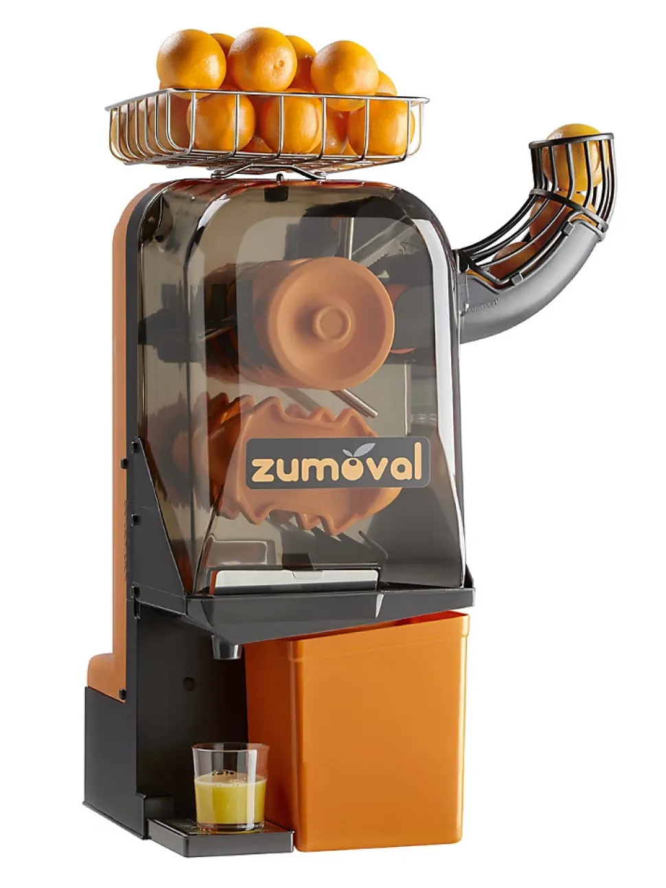 Presse-agrume professionnel Minimax avec option de nettoyage automatique Presse-agrume professionnel Minimax avec option de nettoyage automatique MINIMAX La plus petiteNos presses agrumes sont totalement automatiques: Il n’est pas nécessaire de couper les oranges en deux. Seulement les déposer dans le bac de fruits et la machine fera tout pour vous, á une grande vitesse. Notre système de rotation exclusif á un fonctionnement très attractif et visible, qui attire l’attention des consommateurs, ce qui augmente la demande de jus. Pendant le pressage, le jus n’a pas de contact avec la peau, ce qui évite la saveur amère.Équipé d’un moteur de 0,75 CV et équipé d’engrenages en acier, le modèle Minimax est certainement, comme le reste de la gamme Zumoval, la machine le plus résistant et robuste de la marché. La machine n’a pas besoin de entretien. Extrêmement intuitif et facile à utiliser. Rapide et facile à enlever pour le lavage. En seulement une minute la machine est prête pour le nettoyage que ne prend pas plus de 3 minutesLame d’acier inoxydable: coupe parfaite de l’orangeCapacité tube d’alimentation 6 fruits Système exclusif pressage rotatif Zumoval Sans contact avec la peauInstallation : sur tableCapot frontale très résistant Petit machine. idéal pour des endroits avec peu d´espace*Double filtre qui filtrent les graines * Inclus dans les machines avec l´option self service15 Fruits par minute 60 Litres par heure Petit machine. Idéal pour des endroits avec peu d´espace: Cafés, les bars à jus, bar à cocktails, petits hôtels, petits restaurants, …Production : 15 oranges par minute, soit 1 litre – Diamètre des oranges : 60 à 80 mm Alimentation manuelle – Capacité d’alimentation : 6 oranges Voltage (monophasé):230V. – 50/60 Hz Protection électrique :Surtension et température Sécurité:Détecteur inductif de proximite poids :51,3kgs Dimensions extérieures L x P x H : 330 x 450 x 740mm -Bacs a écorces 9 kg Avec option nettoyage automatique. Orange – l0.1- L0.1- P0.1- h0.1