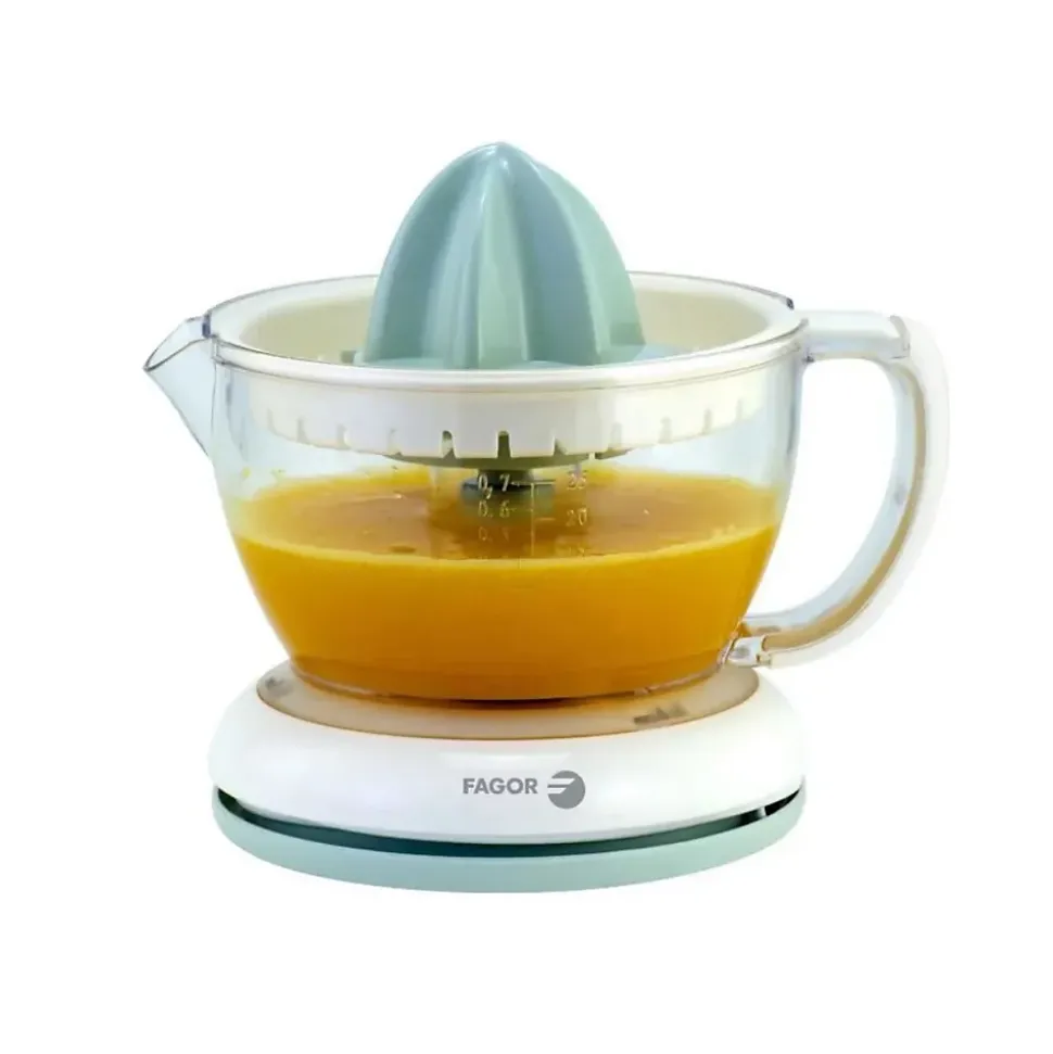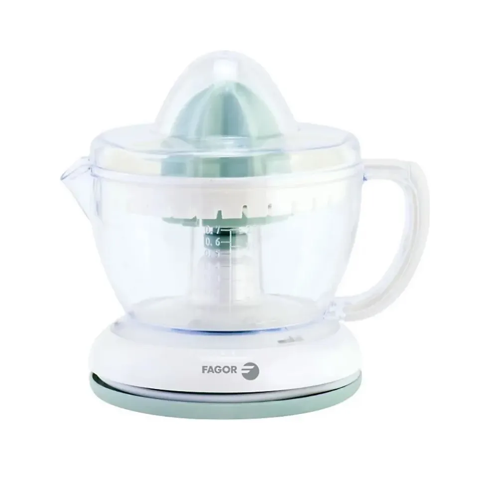 Découvrez le presse-agrumes électrique FAGOR FGPA07, puissant avec 40W et une capacité de 0,7L. Il dispose d’un réservoir transparent et gradué, d’un bec verseur pratique, de 2 cônes pour différents agrumes et d’un rangement pour le cordon.