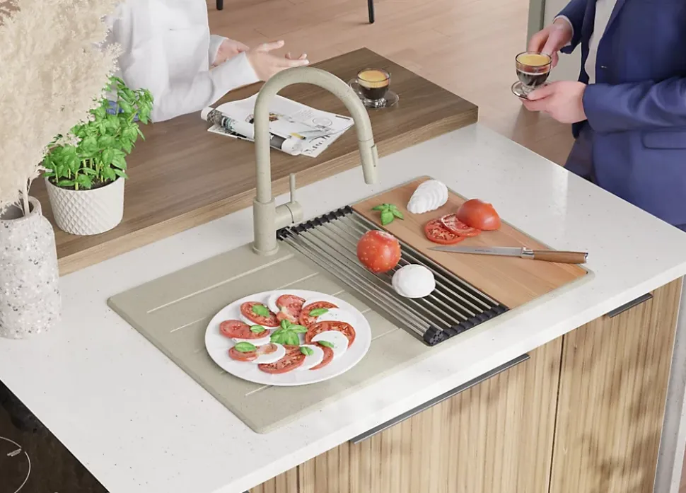 - ✅ STATION DE TRAVAIL MULTIFONCTIONNELLE – l’Évier est doté d’un rebord spécial sur lequel vous pouvez placer des Accessoires pour évier dédiés tels qu’un Égouttoir enroulable ou une planche à découper. Vous pouvez simultanément laver, couper et sécher les produits. Le grand Égouttoir minimaliste est idéal pour sécher même des ustensiles non standard. Il sera un endroit pratique pour les déposer avant le lavage, ce qui permettra de maintenir l’ordre autour de l’Évier.