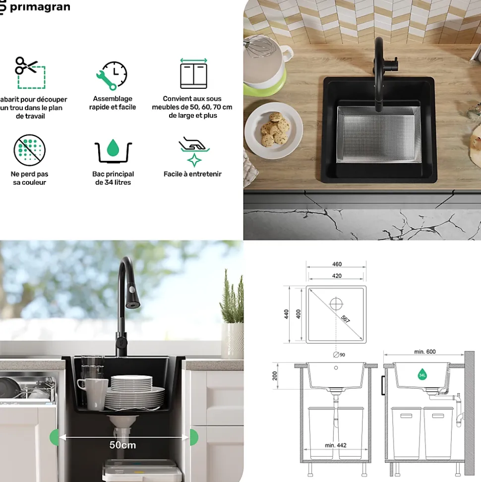 Évier encastrable en granit Venise 50 Easy Slim – design classique intemporel et fonctionnalité Le modèle Venise 50 Easy Slim, conçu dans une forme classique, assure un confort d’utilisation grâce à sa vasque spacieuse XL aux dimensions impressionnantes de 420 mm x 400 mm x 200 mm, qui peut certainement contenir une grande quantité de vaisselle et relever les défis quotidiens. Les coins de la vasque avec un rayon R20 ajoutent de la fonctionnalité, permettant d’éliminer rapidement et sans effort les salissures. Son design subtil et classique s’intègre parfaitement dans toute cuisine, qu’elle soit classique ou moderne. L’évier peut être installé dans des meubles à partir de 50, 60, 70 cm et plus. Le kit comprend: Évier Venise 50 Easy Slim , Robinet de cuisine BW5010-KW, kit complet de vidange (siphon haute qualité, trop-plein, raccordement supplémentaire pour lave-linge ou lave-vaisselle), flexibles de raccordement 3/8” de 400 mm, double joints d’étanchéité.
