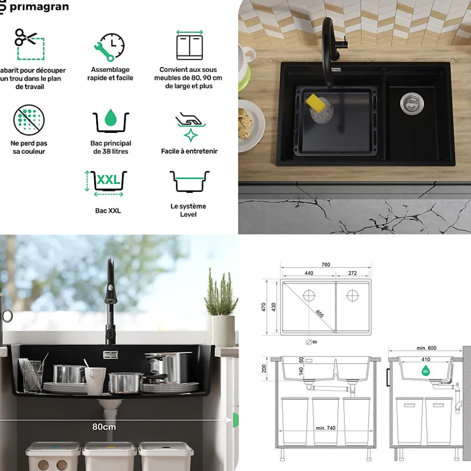 - ✅ Le kit comprend – Évier Prague 80 Duo Level Slim, kit complet de vidange (siphon haute qualité, trop-plein, raccordement supplémentaire pour lave-linge ou lave-vaisselle).