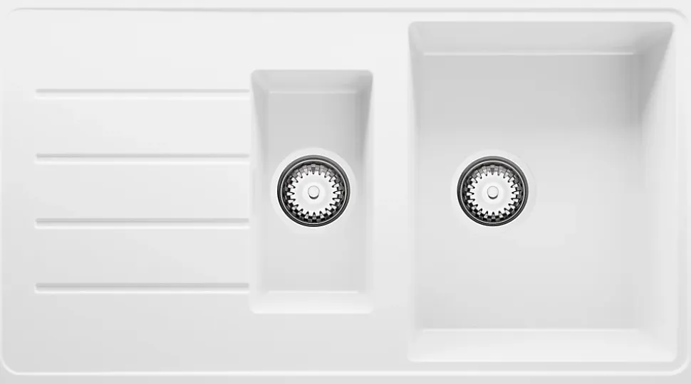 PRIMAGRAN Evier Cuisine en Granit Blanc 90x50cm, Lavabo 1,5 bacs + Kit de Vidage + Accessoires, Évier à Encastrer au meuble 60cm