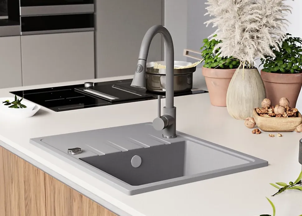 Évier en granit Milan 620-40 – caractère et fonctionnalité Vous souhaitez miser sur la fonctionnalité, le caractère et le confort ? Optez pour le modèle d’évier en granit de la série Milan. La cuve profonde et l’égouttoir profilé facilitent le lavage, tandis que les rainures évacuent rapidement l’eau, laissant vos ustensiles secs. Le modèle Milan 620-40 est conçu pour les meubles d’une dimension à partir de 40 cm. Le kit comprend: Évier Milan 620-40, kit complet de vidange (siphon haute qualité, trop-plein, raccordement supplémentaire pour lave-linge ou lave-vaisselle).