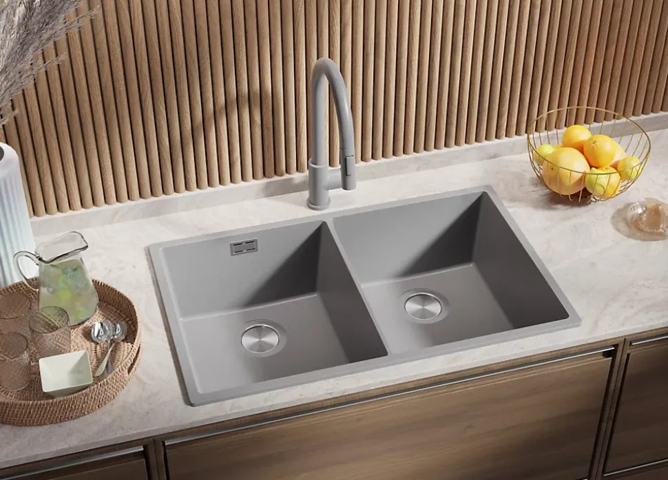 Évier encastrable de cuisine en granit London 80 Twin Slim – design et minimaliste Vous recherchez un évier moderne pour votre cuisine, caractérisé par le minimalisme et la conception ? Choisissez le modèle London 80 Twin Slim avec deux grands bacs – une conception minimaliste et pratique, qui vous offrira confort lors du lavage et de la préparation des repas. L’évier peut être installé dans des meubles de 80 cm, 90 cm et plus grands. Le kit comprend: Évier London 80 Twin Slim, kit complet de vidange (siphon haute qualité, trop-plein, raccordement supplémentaire pour lave-linge ou lave-vaisselle).
