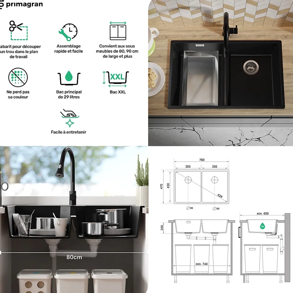 - ✅ Le kit comprend – Évier London 80 Twin Slim, kit complet de vidange (siphon haute qualité, trop-plein, raccordement supplémentaire pour lave-linge ou lave-vaisselle).