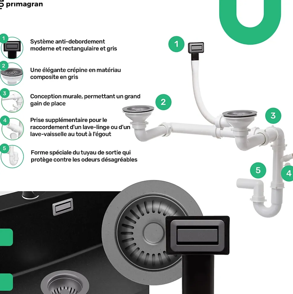 - ✅ Le kit comprend – Évier Madrid 80 Twin, kit complet de vidange (siphon haute qualité, trop-plein, raccordement supplémentaire pour lave-linge ou lave-vaisselle).