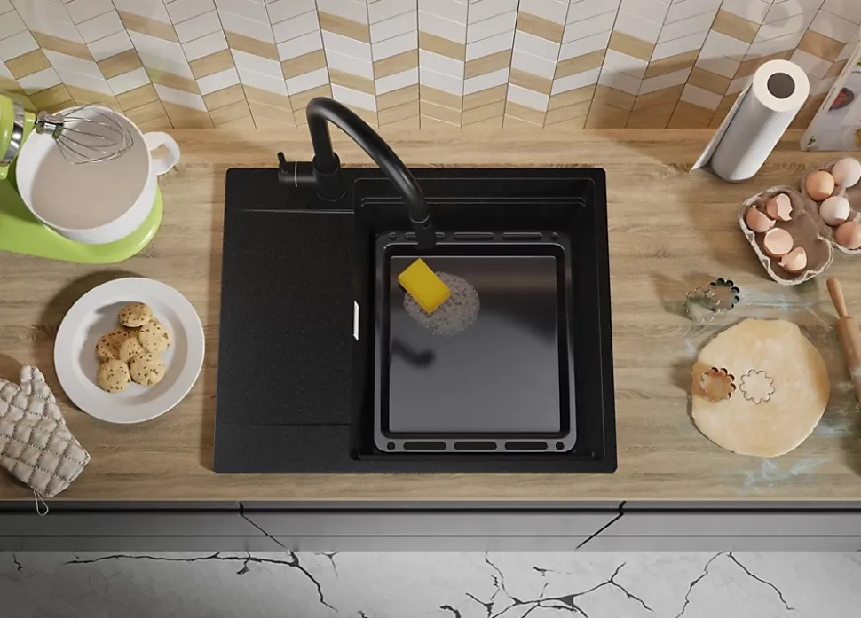 - ✅ Le kit comprend – Évier San Francisco 620-50 Level, kit complet de vidange (siphon haute qualité, trop-plein, raccordement supplémentaire pour lave-linge ou lave-vaisselle), égouttoir enroulable.
