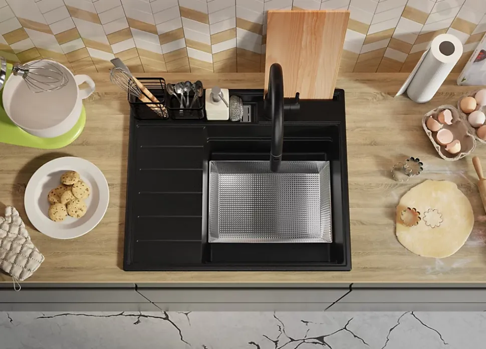 PRIMAGRAN Evier Cuisine en Granit Noir 62x53cm, Lavabo 1 bac + Kit de Vidage + Accessoires, Évier à Encastrer au meuble 45cm