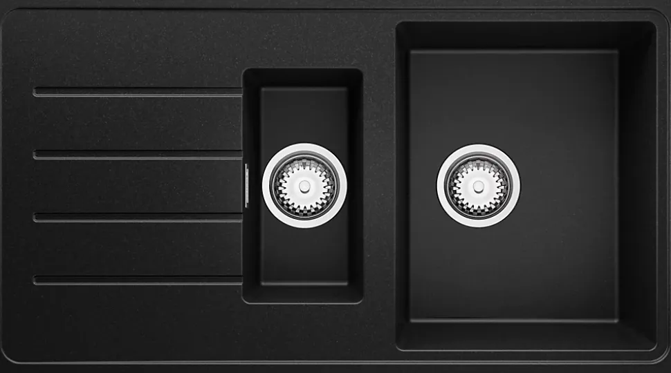 PRIMAGRAN Evier Cuisine en Granit Noir 90x50cm, Lavabo 1,5 bacs + Kit de Vidage + Accessoires, Évier à Encastrer au meuble 60cm