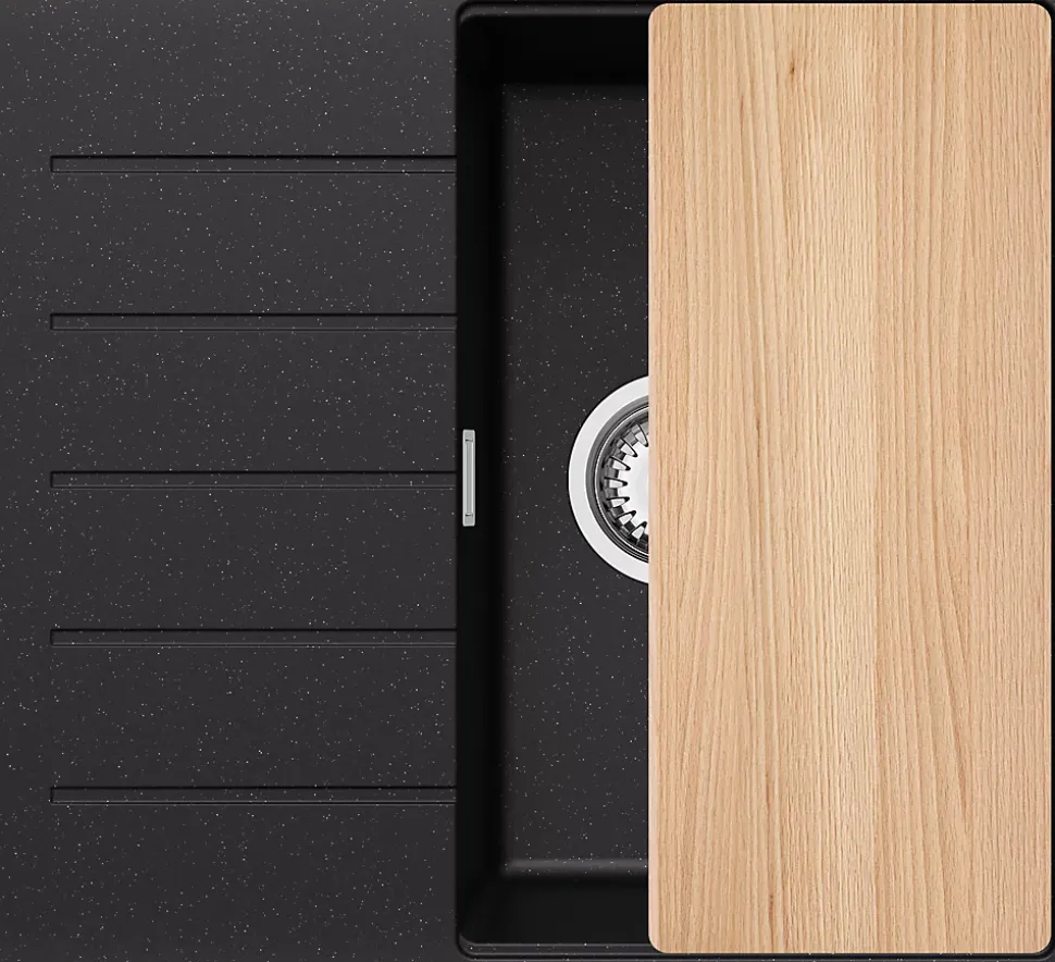 - ✅ Le kit comprend – Évier Copenhague 550-40 Top, kit complet de vidange (siphon haute qualité, trop-plein, raccordement supplémentaire pour lave-linge ou lave-vaisselle), planche à découper.
