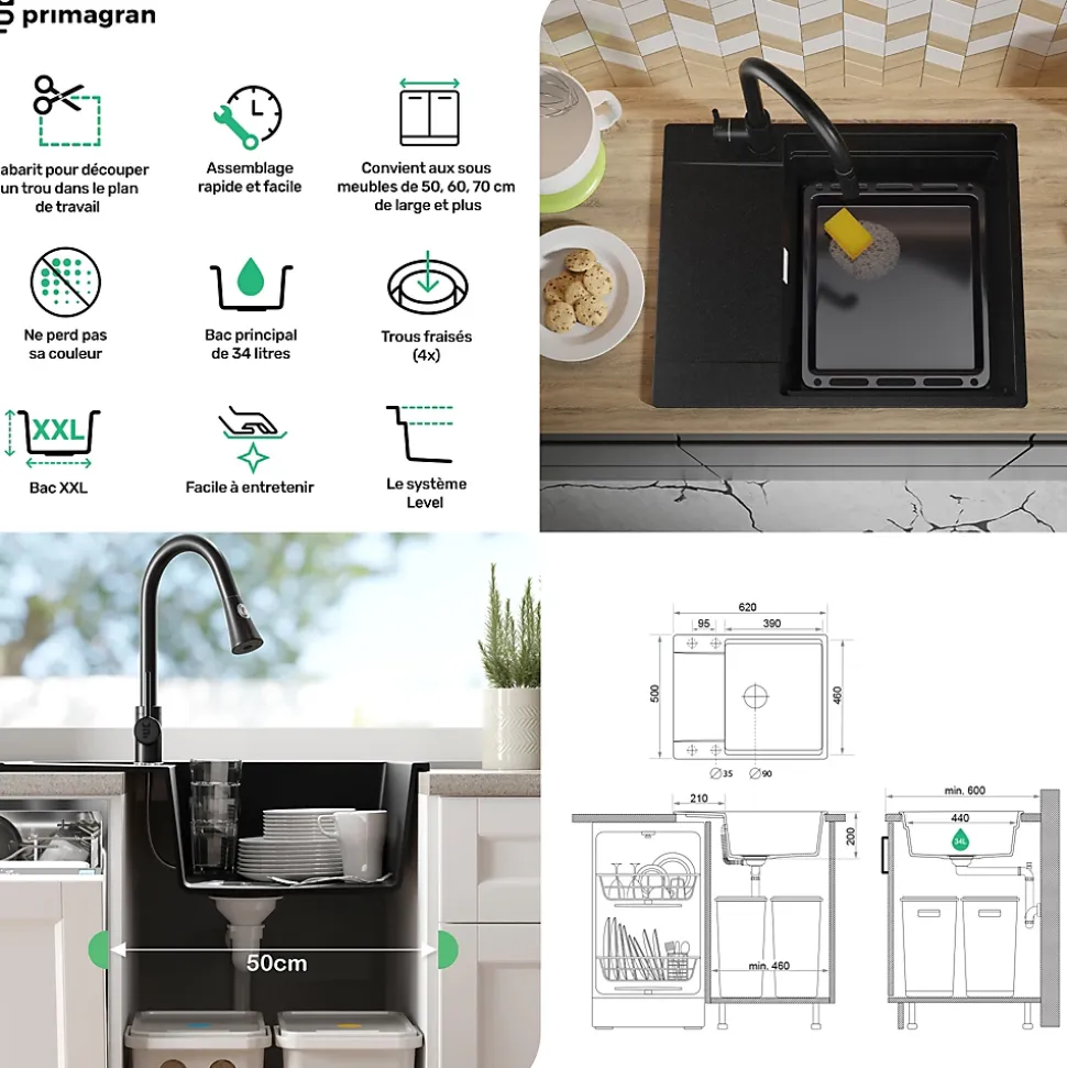- ✅ Le kit comprend – Évier San Francisco 620-50 Level, kit complet de vidange (siphon haute qualité, trop-plein, raccordement supplémentaire pour lave-linge ou lave-vaisselle), égouttoir enroulable.