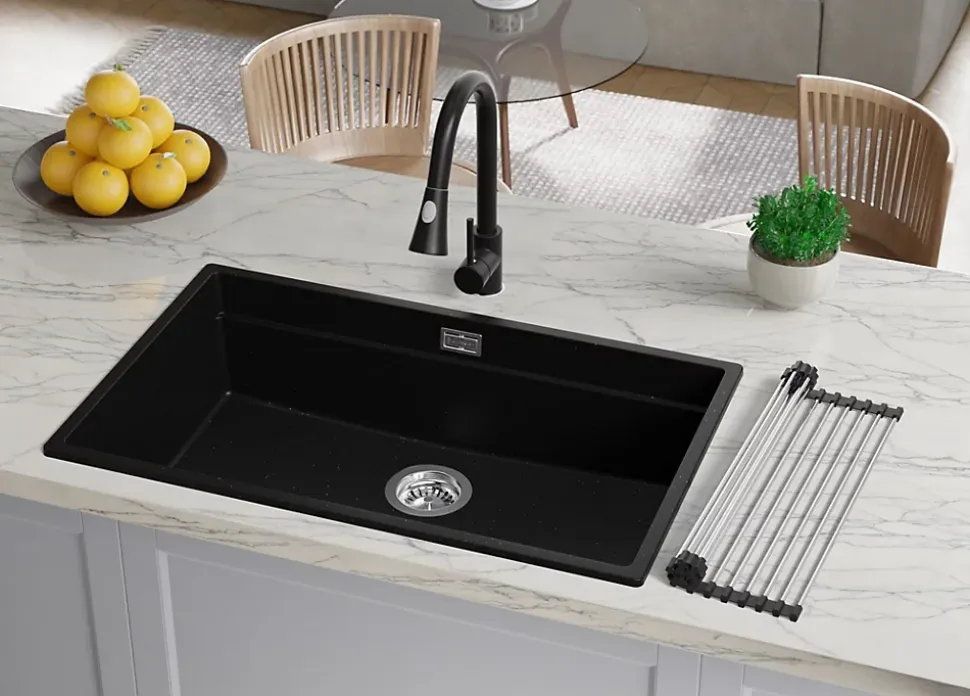 - ✅ Le kit comprend – Évier Prague 90 Level Slim, kit complet de vidange (siphon haute qualité, trop-plein, raccordement supplémentaire pour lave-linge ou lave-vaisselle), égouttoir enroulable.