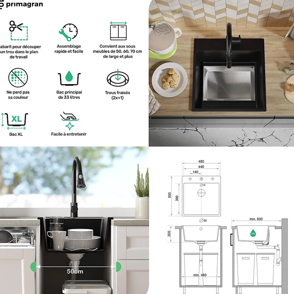 - ✅ Le kit comprend – Évier Riga 50, kit complet de vidange (siphon haute qualité, trop-plein, raccordement supplémentaire pour lave-linge ou lave-vaisselle).