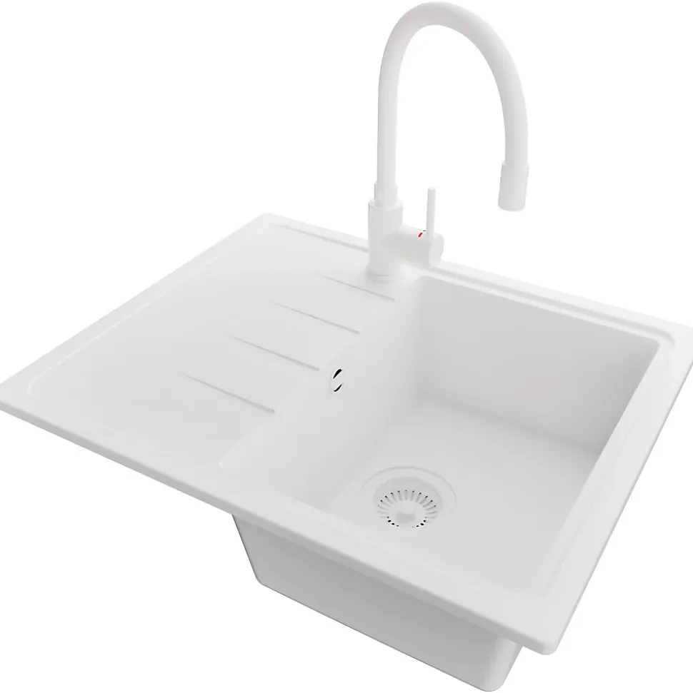 PRIMAGRAN Evier Cuisine en Granit Tout Blanc 62x50cm, Lavabo 1 bac + Accessoires, Évier à Encastrer au meuble 40cm