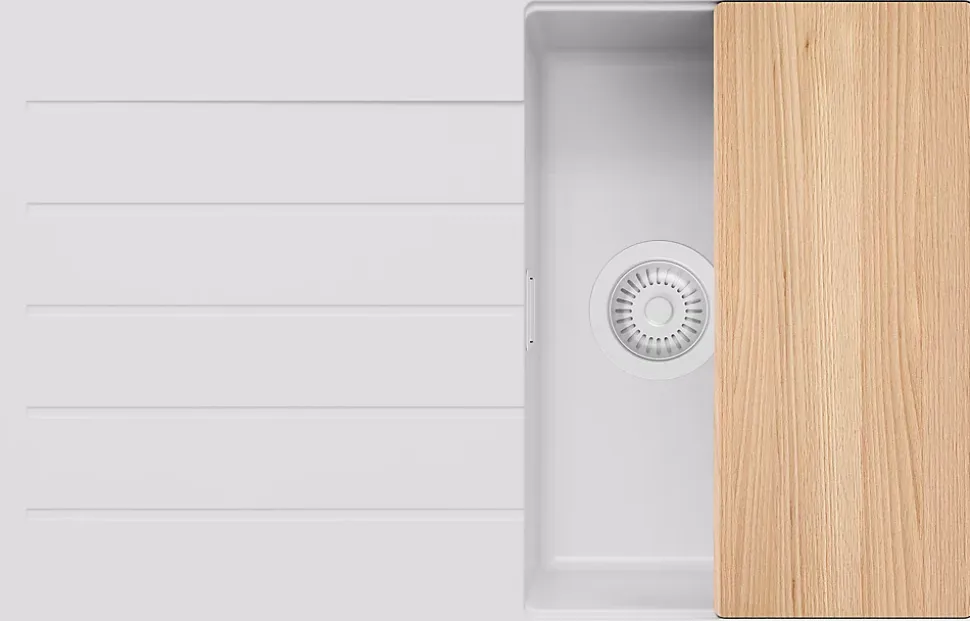 - ✅ Le kit comprend – Évier Copenhague 780-45 Top, kit complet de vidange (siphon haute qualité, trop-plein, raccordement supplémentaire pour lave-linge ou lave-vaisselle), planche à découper.
