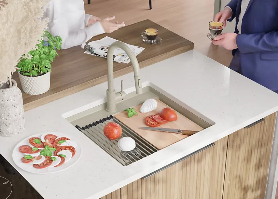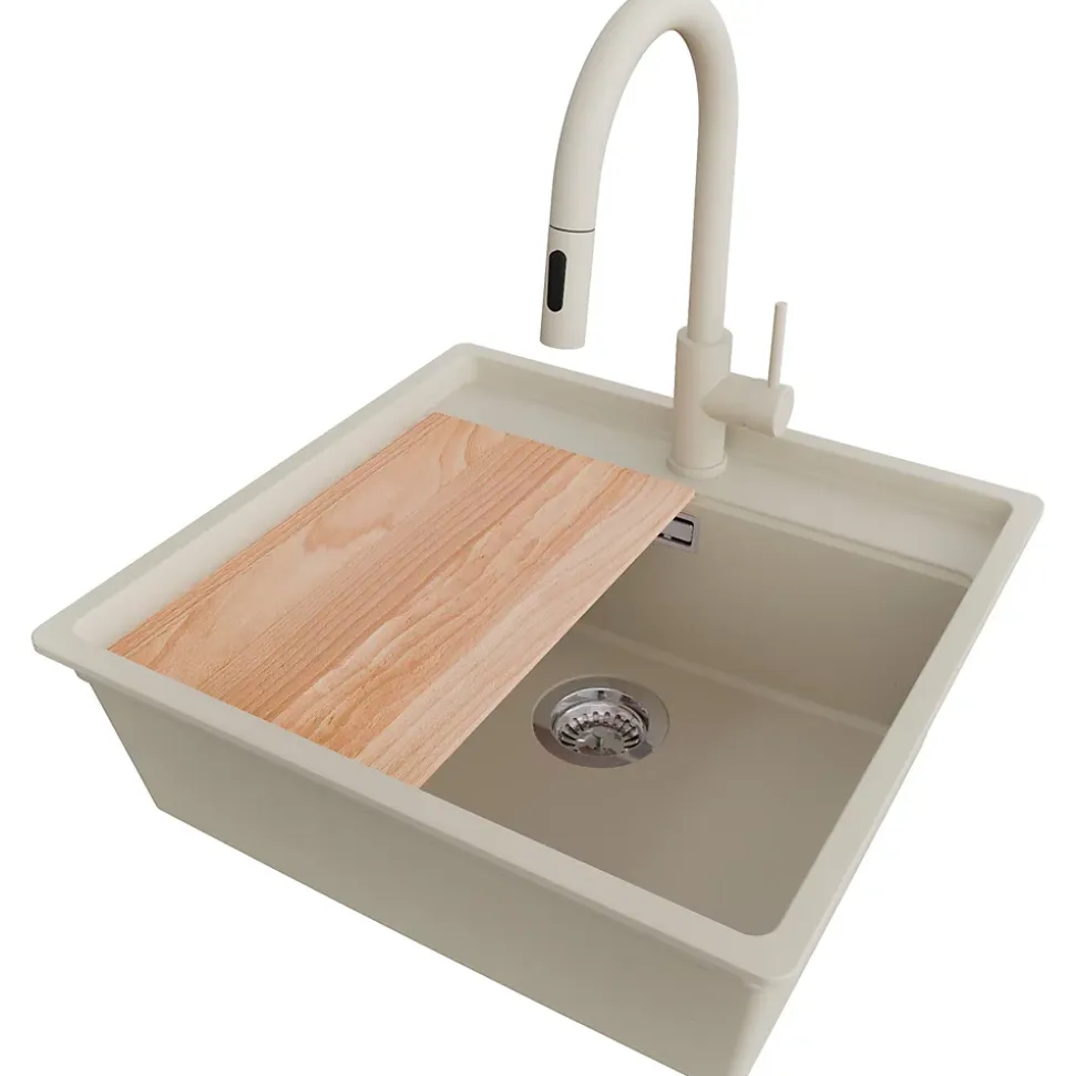 - ✅ Le kit comprend – Évier Bergen 60 Low Cut Top, robinet de cuisine Primagran 9010 beige avec Bec extractible et 2 types de jet, kit complet de vidange (siphon haute qualité, trop-plein, raccordement supplémentaire pour lave-linge ou lave-vaisselle), flexibles de raccordement 3/8” de 400 mm, double joints d’étanchéité, planche à découper.